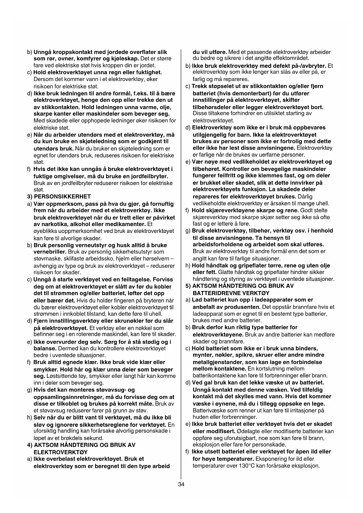 a) Lad batteriet kun opp i ladeapparater som er anbefalt av produsenten. Det oppstår brannfare hvis et ladeapparat som er egnet til en bestemt type batterier, brukes med andre batterier. b) Bruk derfor kun riktig type batterier for elektroverktøyene. Bruk av andre batterier kan medføre skader og brannfare. c) Hold batteriet som ikke er i bruk unna binders, mynter, nøkler, spikre, skruer eller andre mindre metallgjenstander, som kan lage en forbindelse mellom kontaktene. En kortslutning mellom batterikontaktene kan føre til forbrenninger eller brann. d) Ved gal bruk kan det lekke væske ut av batteriet. Unngå kontakt med denne væsken. Ved tilfeldig kontakt må det skylles med vann. Hvis det kommer væske i øynene, må du i tillegg oppsøke en lege. Batterivæske som renner ut kan føre til irritasjoner på huden eller forbrenninger. e) Ikke bruk batteriet eller verktøyet hvis det er skadet eller modifisert. Ødelagte eller modiserte batterier kan oppføre seg uforutsigbart, noe som kan føre til brann, eksplosjon eller fare for personskade. f) Ikke utsett batteriet eller verktøyet for åpen ild eller for høye temperaturer. Eksponering for ild eller temperaturer over 130°C kan forårsake eksplosjon.35 g) Følg alle ladeinstrukser, og ikke lad batteriet eller verktøyet utenfor temperaturområdet som er spesifisert i bruksanvisningen. Feil lading eller lading ved temperaturer utenfor det spesiserte temperaturområdet, kan skade batteriet og øke brannfaren.