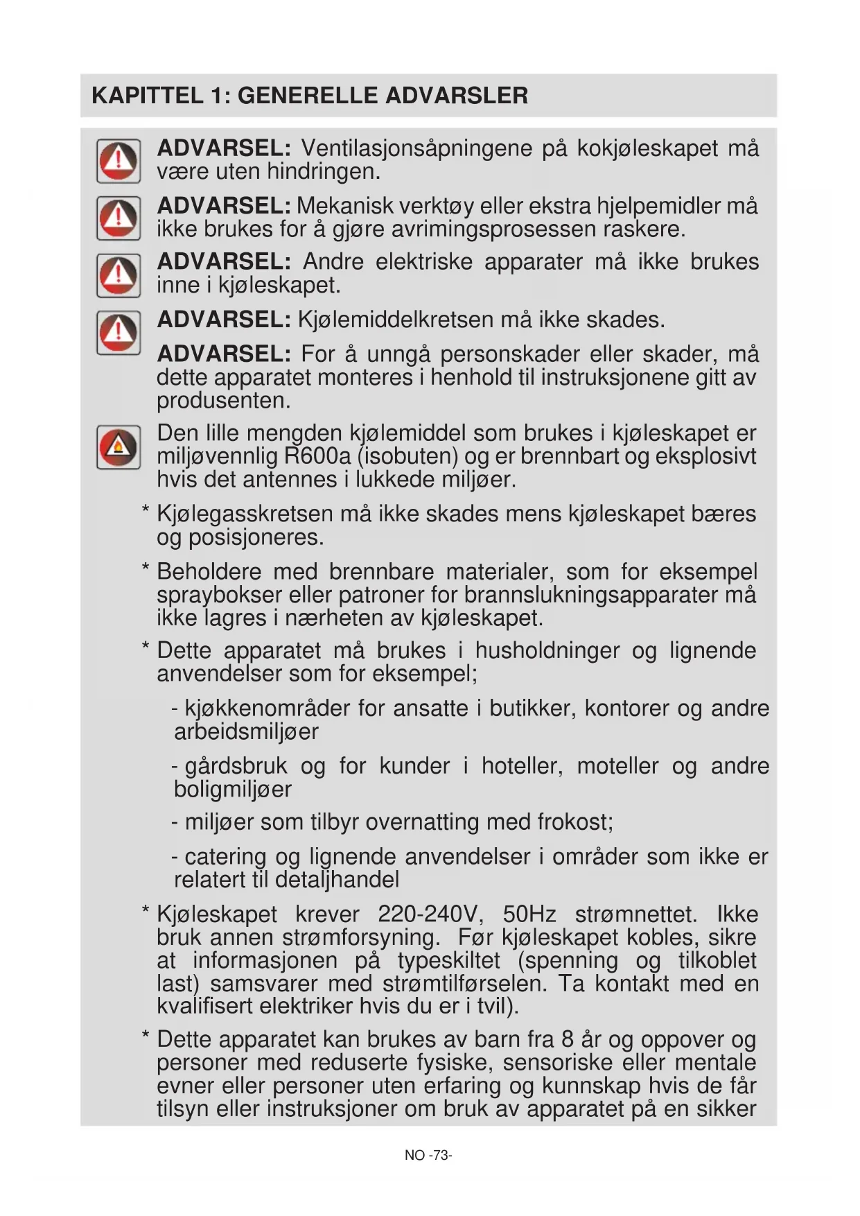 ADVARSEL: Ventilasjonsåpningene på kokjøleskapet må være uten hindringen. ADVARSEL: Mekanisk verktøy eller ekstra hjelpemidler må ikke brukes for å gjøre avrimingsprosessen raskere. ADVARSEL: Andre elektriske apparater må ikke brukes inne i kjøleskapet. ADVARSEL: Kjølemiddelkretsen må ikke skades. ADVARSEL: For å unngå personskader eller skader, må dette apparatet monteres i henhold til instruksjonene gitt av produsenten. Den lille mengden kjølemiddel som brukes i kjøleskapet er miljøvennlig R600a (isobuten) og er brennbart og eksplosivt hvis det antennes i lukkede miljøer.