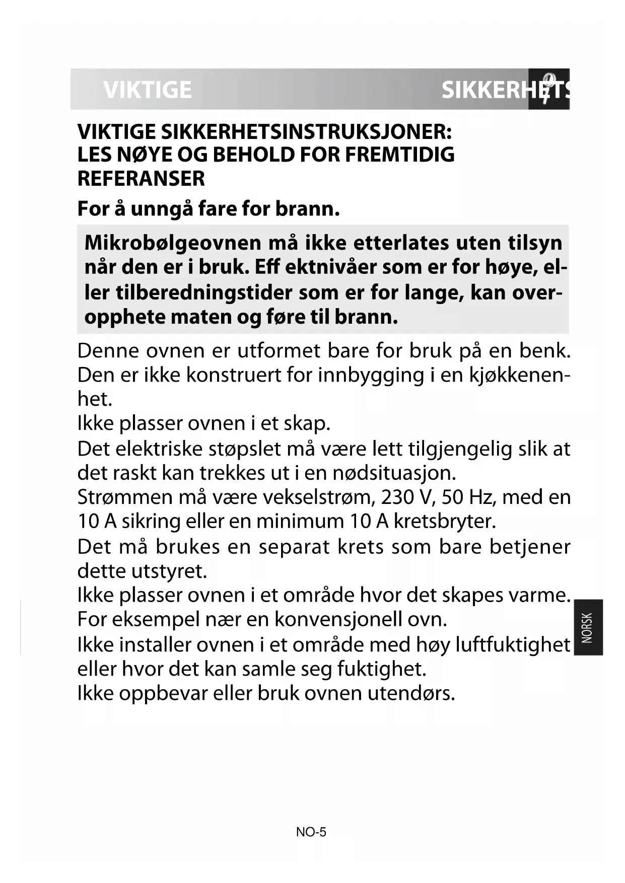 NO-5VIKTIGE SIKKERHETSINSTRUKSJONER