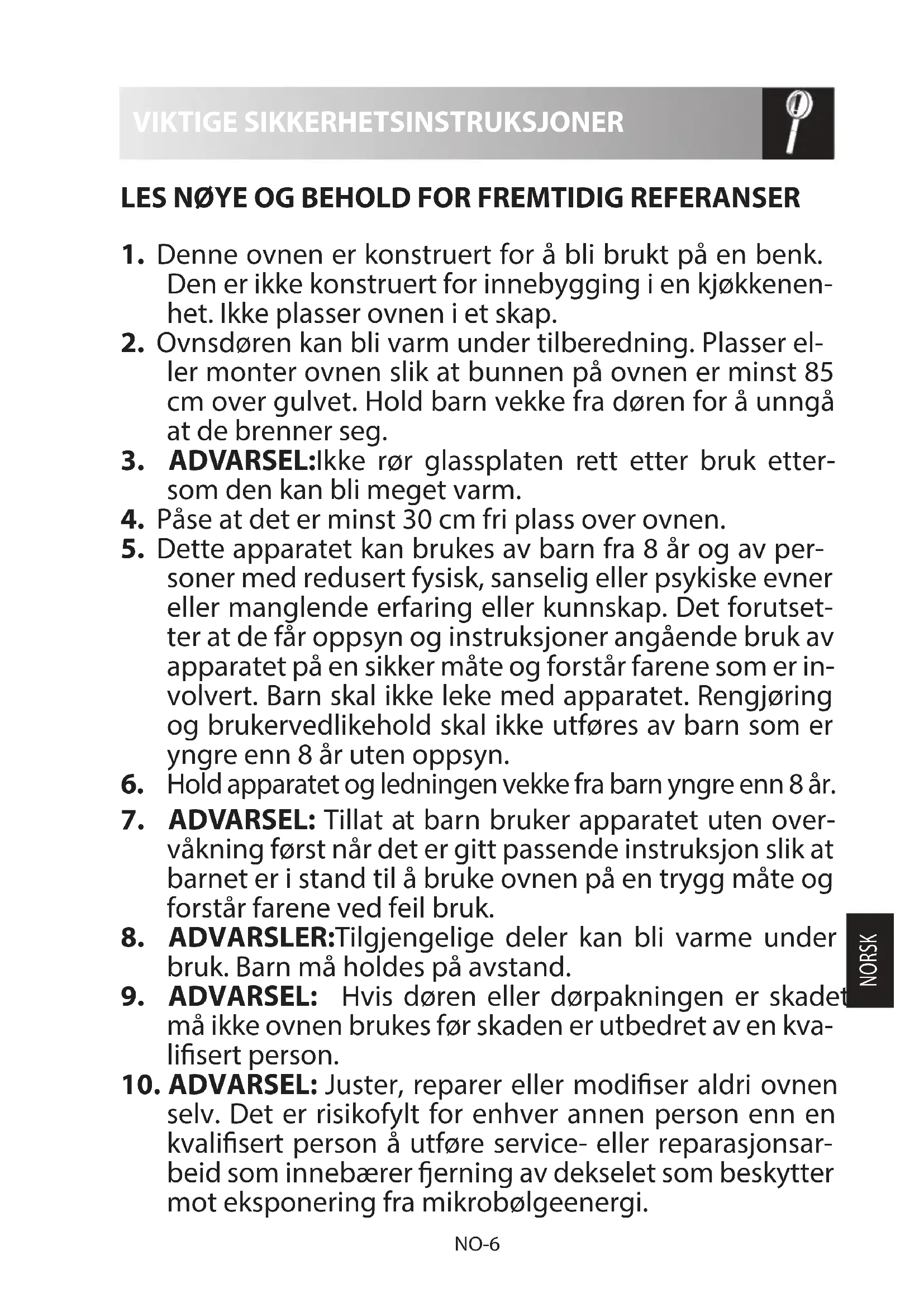 - Reparasjon og modikasjon: Ikke bruk ovnen hvis den ikke fungerer ordentlig.