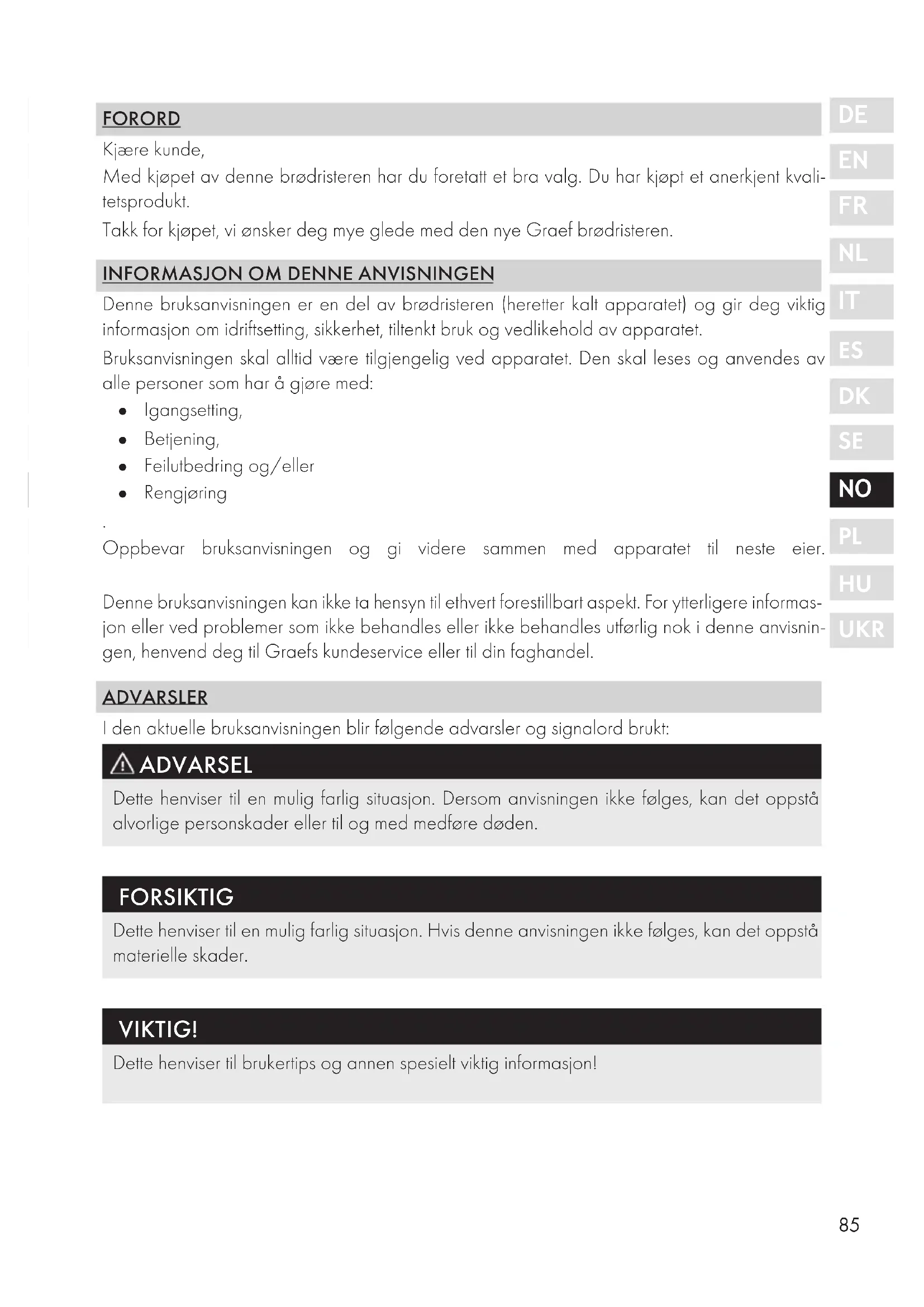 UKR FORORD Kjære kunde, Med kjøpet av denne brødristeren har du foretatt et bra valg. Du har kjøpt et anerkjent kvali- tetsprodukt. Takk for kjøpet, vi ønsker deg mye glede med den nye Graef brødristeren.