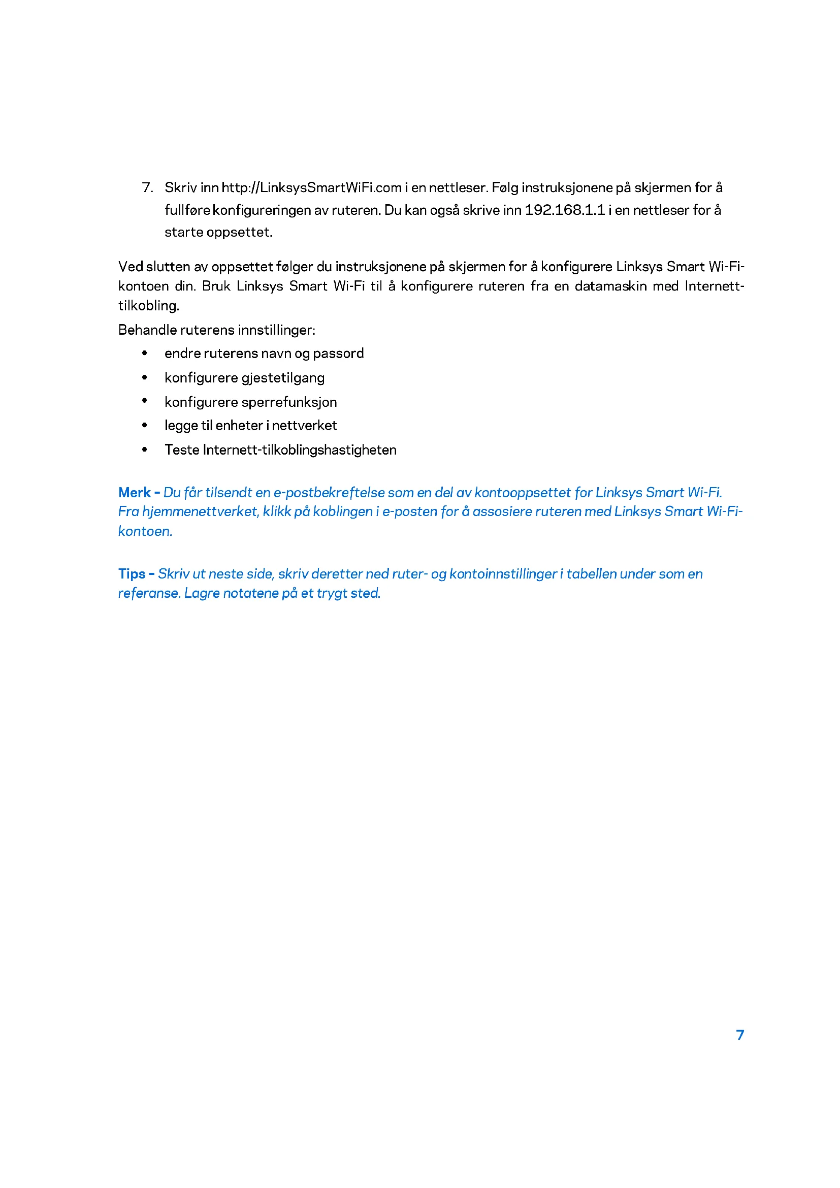 Teste Internett-tilkoblingshastigheten Merk – Du får tilsendt en e-postbekreftelse som en del av kontooppsettet for Linksys Smart Wi-Fi. Fra hjemmenettverket, klikk på koblingen i e-posten for å assosiere ruteren med Linksys Smart Wi-Fi- kontoen. Tips – Skriv ut neste side, skriv deretter ned ruter- og kontoinnstillinger i tabellen under som en referanse. Lagre notatene på et trygt sted.8 Nettverksnavn 2,4 GHz Nettverkspassord Nettverksnavn 5 GHz Nettverkspassord Ruterpassord Navn på gjestenettverk Passord for gjestenettverk Brukernavn for Linksys Smart Wi-Fi Passord for Linksys Smart Wi-Fi9 Slik bruker du Linksys Smart Wi-Fi Du kan konfigurere ruteren fra hvor som helst ved å bruke Linksys Smart Wi-Fi, men du kan også konfigurere ruteren direkte fra hjemmenettverket. Linksys Smart Wi-Fi kan også være tilgjengelig for den mobile enheten. Se enhetens appbutikk for informasjon. Slik kobler du til Linksys Smart Wi-Fi Slik kobler du til Linksys Smart Wi-Fi: