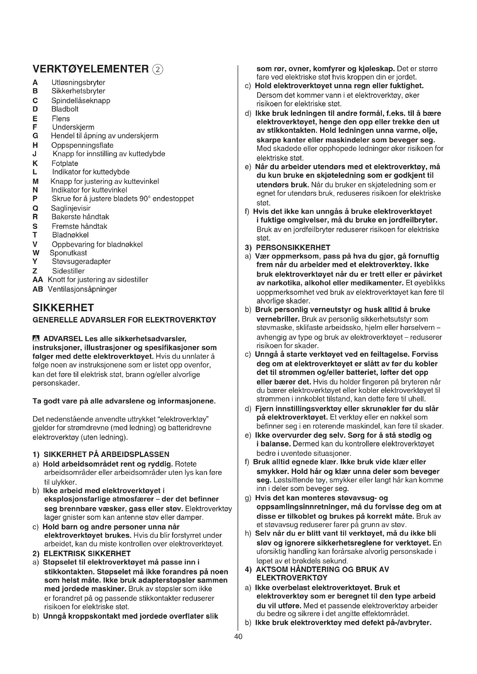 A Utløsningsbryter B Sikkerhetsbryter C Spindellåseknapp D Bladbolt E Flens F Underskjerm G Hendel til åpning av underskjerm H Oppspenningsate J Knapp for innstilling av kuttedybde K Fotplate L Indikator for kuttedybde M Knapp for justering av kuttevinkel N Indikator for kuttevinkel P Skrue for å justere bladets 90° endestoppet Q Saglinjevisir R Bakerste håndtak S Fremste håndtak T Bladnøkkel V Oppbevaring for bladnøkkel W Sponutkast Y Støvsugeradapter Z Sidestiller AA Knott for justering av sidestiller AB Ventilasjonsåpninger SIKKERHET