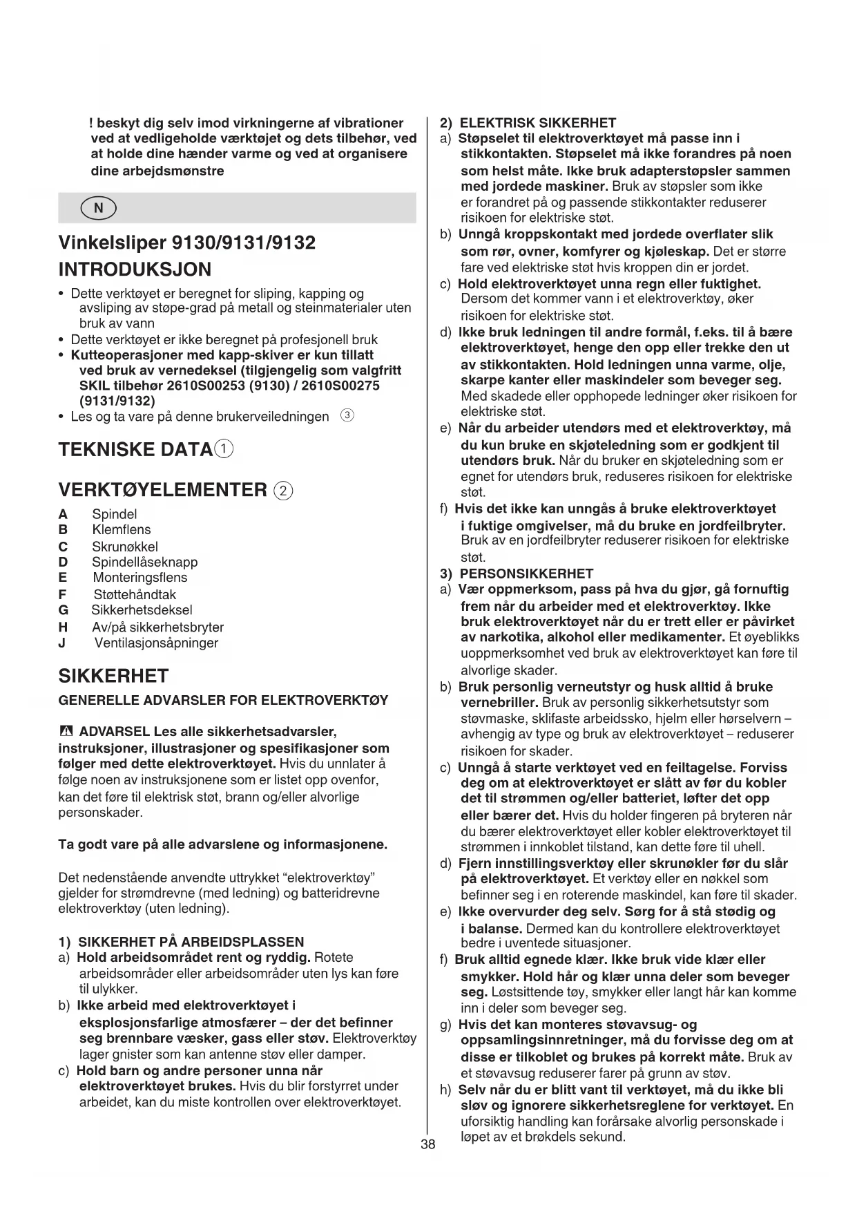 A Spindel B Klemens C Skrunøkkel D Spindellåseknapp E Monteringsens F Støttehåndtak G Sikkerhetsdeksel H Av/på sikkerhetsbryter J Ventilasjonsåpninger SIKKERHET