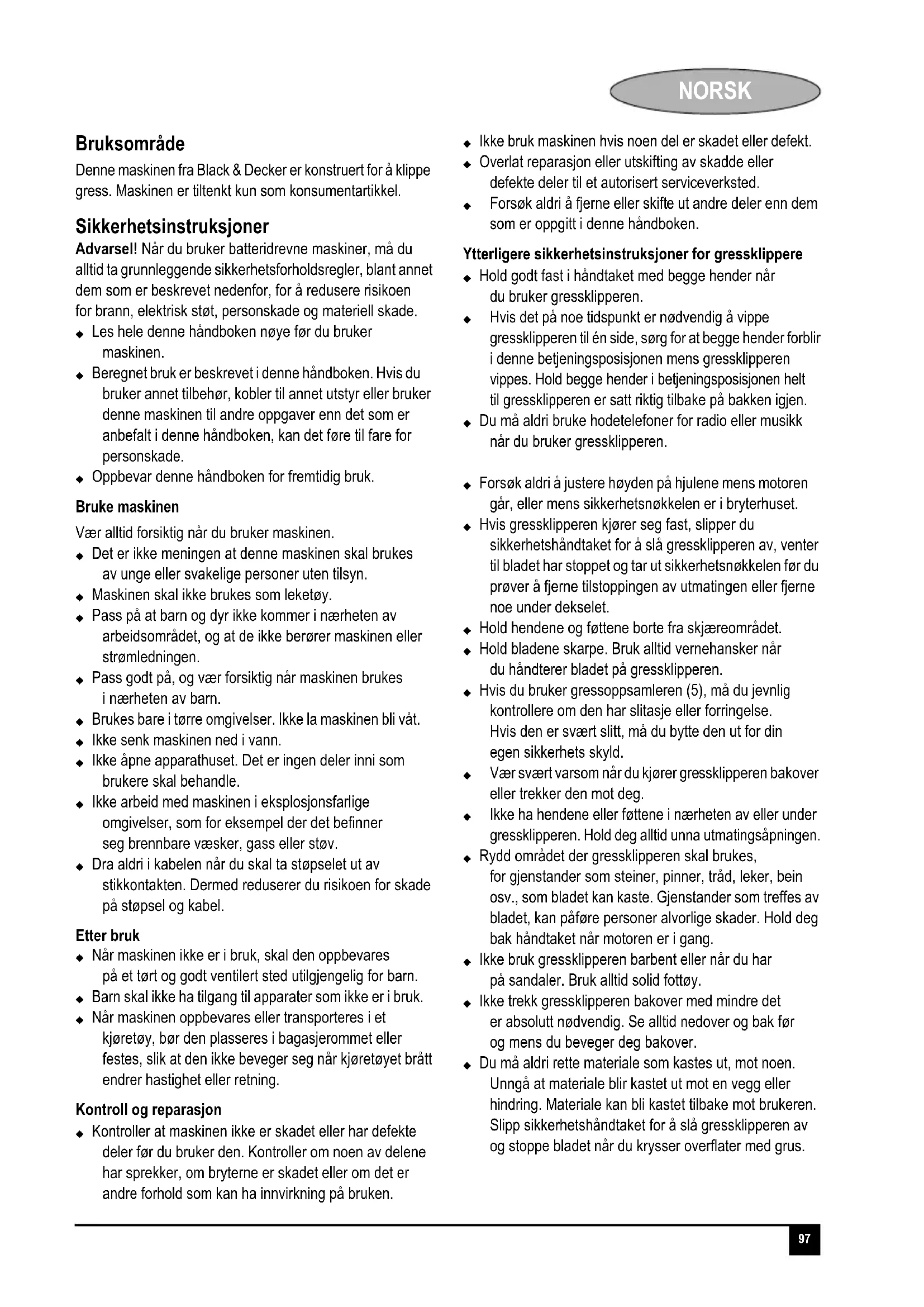 NORSK Norsk Bruksområde Denne maskinen fra Black & Decker er konstruert for å klippe gress. Maskinen er tiltenkt kun som konsumentartikkel. Sikkerhetsinstruksjoner Advarsel! Når du bruker batteridrevne maskiner, må du alltid ta grunnleggende sikkerhetsforholdsregler, blant annet dem som er beskrevet nedenfor, for å redusere risikoen for brann, elektrisk støt, personskade og materiell skade. Les hele denne håndboken nøye før du bruker maskinen. Beregnet bruk er beskrevet i denne håndboken. Hvis du bruker annet tilbehør, kobler til annet utstyr eller bruker denne maskinen til andre oppgaver enn det som er anbefalt i denne håndboken, kan det føre til fare for personskade. Oppbevar denne håndboken for fremtidig bruk. Bruke maskinen Vær alltid forsiktig når du bruker maskinen. Det er ikke meningen at denne maskinen skal brukes av unge eller svakelige personer uten tilsyn. Maskinen skal ikke brukes som leketøy. Pass på at barn og dyr ikke kommer i nærheten av arbeidsområdet, og at de ikke berører maskinen eller strømledningen. Pass godt på, og vær forsiktig når maskinen brukes i nærheten av barn. Brukes bare i tørre omgivelser. Ikke la maskinen bli våt. Ikke senk maskinen ned i vann. Ikke åpne apparathuset. Det er ingen deler inni som brukere skal behandle. Ikke arbeid med maskinen i eksplosjonsfarlige omgivelser, som for eksempel der det befinner seg brennbare væsker, gass eller støv. Dra aldri i kabelen når du skal ta støpselet ut av stikkontakten. Dermed reduserer du risikoen for skade på støpsel og kabel. Etter bruk Når maskinen ikke er i bruk, skal den oppbevares på et tørt og godt ventilert sted utilgjengelig for barn. Barn skal ikke ha tilgang til apparater som ikke er i bruk. Når maskinen oppbevares eller transporteres i et kjøretøy, bør den plasseres i bagasjerommet eller festes, slik at den ikke beveger seg når kjøretøyet brått endrer hastighet eller retning. Kontroll og reparasjon Kontroller at maskinen ikke er skadet eller har defekte deler før du bruker den. Kontroller om noen av delene har sprekker, om bryterne er skadet eller om det er andre forhold som kan ha innvirkning på bruken. Ikke bruk maskinen hvis noen del er skadet eller defekt. Overlat reparasjon eller utskifting av skadde eller defekte deler til et autorisert serviceverksted. Forsøk aldri å fjerne eller skifte ut andre deler enn dem som er oppgitt i denne håndboken. Ytterligere sikkerhetsinstruksjoner for gressklippere Hold godt fast i håndtaket med begge hender når du bruker gressklipperen.