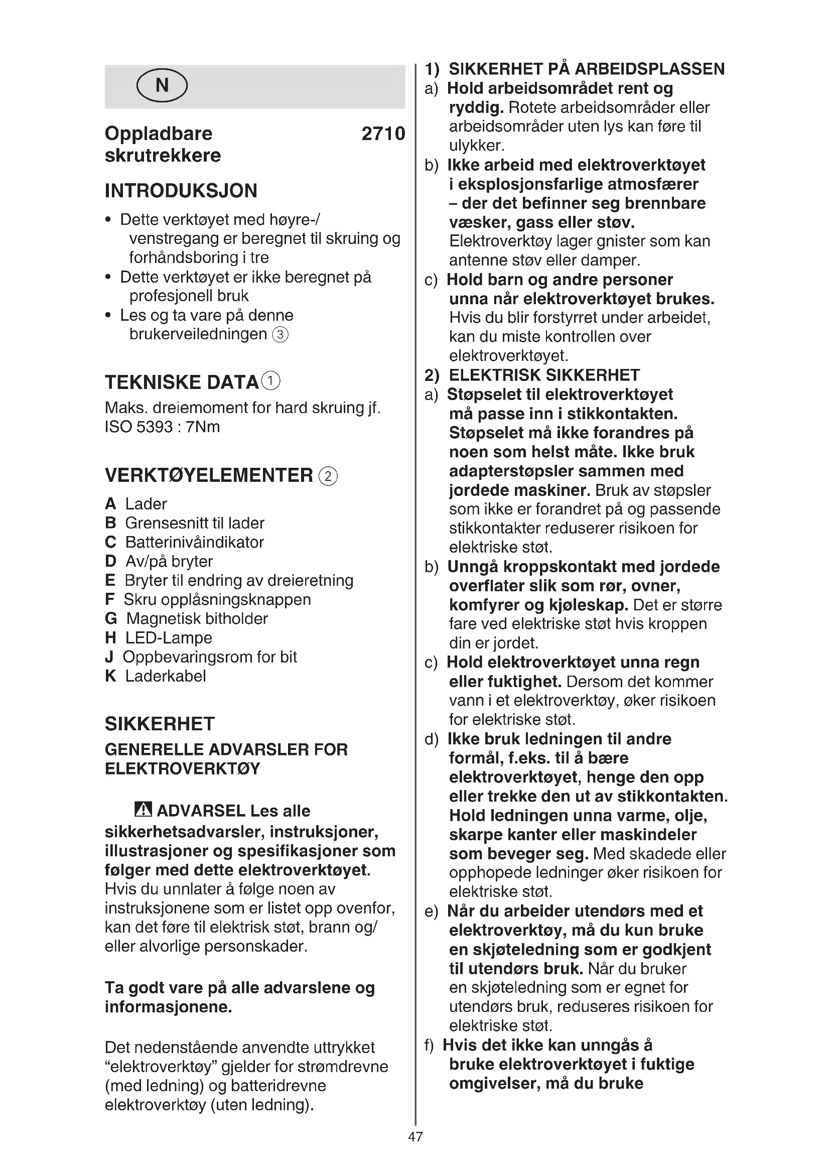 ELEKTROVERKTØY - ADVARSEL Les alle sikkerhetsadvarsler, instruksjoner, illustrasjoner og spesikasjoner som følger med dette elektroverktøyet. Hvis du unnlater å følge noen av instruksjonene som er listet opp ovenfor, kan det føre til elektrisk støt, brann og/ eller alvorlige personskader. Ta godt vare på alle advarslene og informasjonene. Det nedenstående anvendte uttrykket “elektroverktøy” gjelder for strømdrevne (med ledning) og batteridrevne elektroverktøy (uten ledning).48 ignorere sikkerhetsreglene for verktøyet. En uforsiktig handling kan forårsake alvorlig personskade i løpet av et brøkdels sekund.
