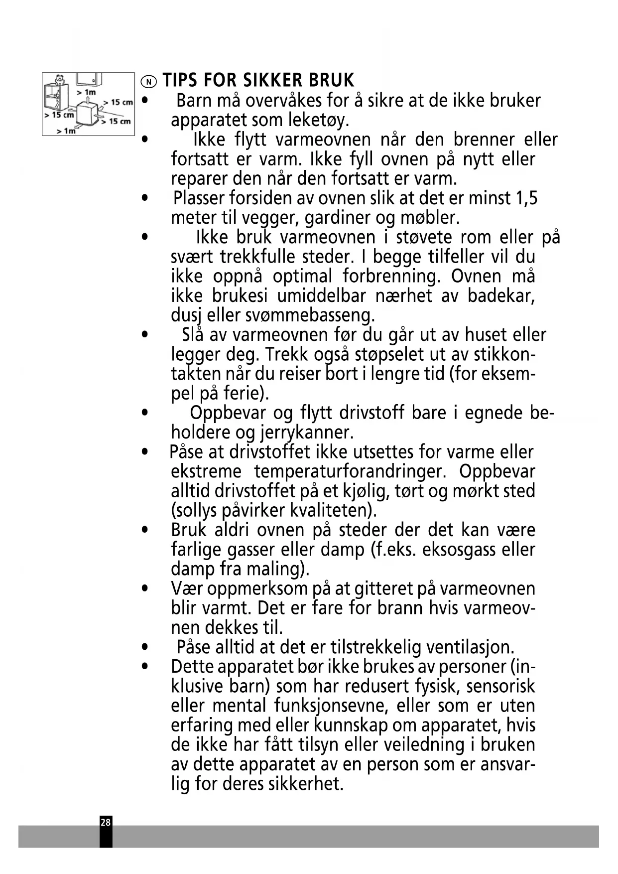 - Ikke bruk varmeovnen i støvete rom eller på svært trekkfulle steder. I begge tilfeller vil du ikke oppnå optimal forbrenning. Ovnen må ikke brukesi umiddelbar nærhet av badekar, dusj eller svømmebasseng.