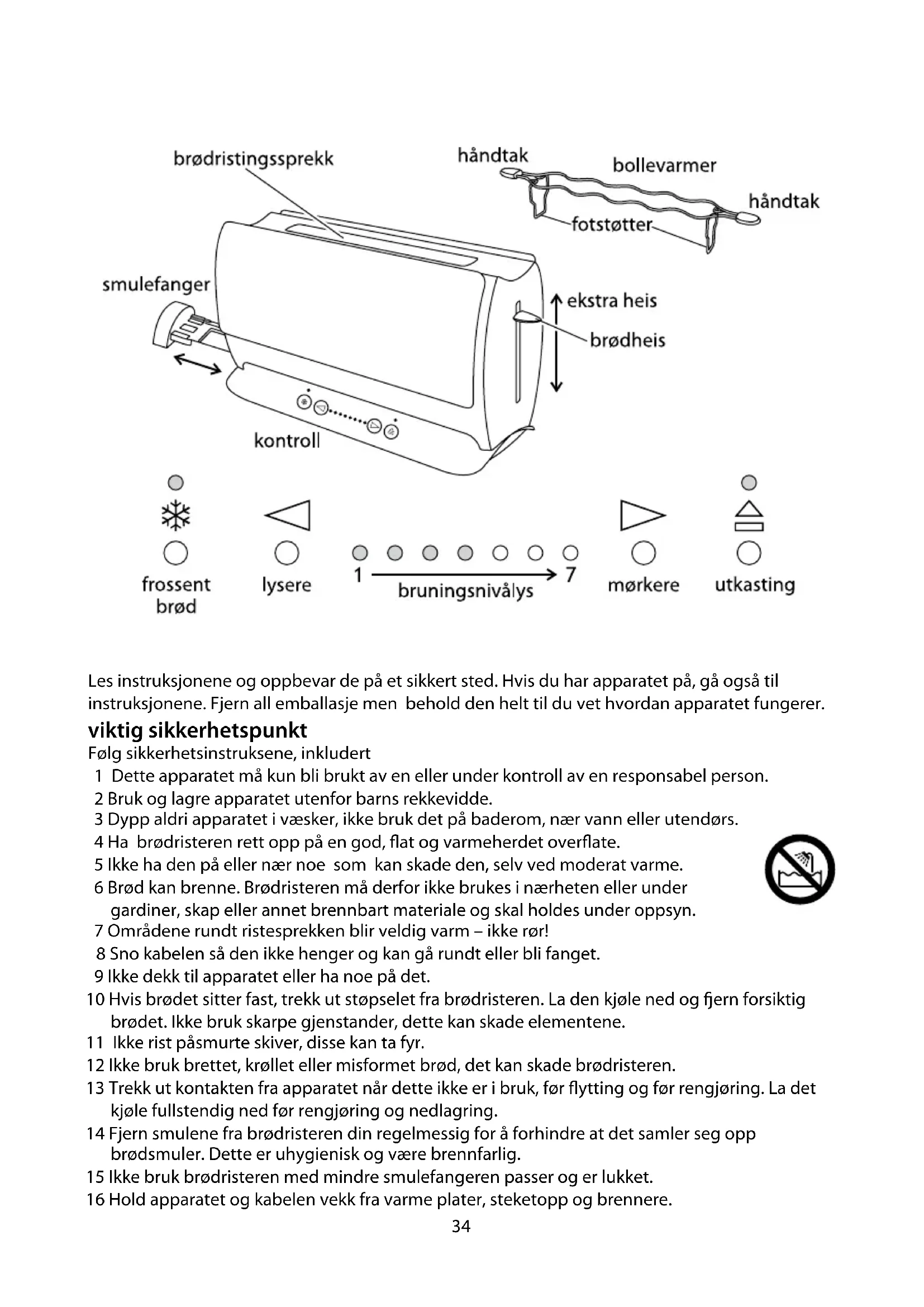 Brødristeren er hovedsakelig designet for brød. Unngå å riste matvarer som er for tykke eller fuktige, da de kan blokkere sporene.