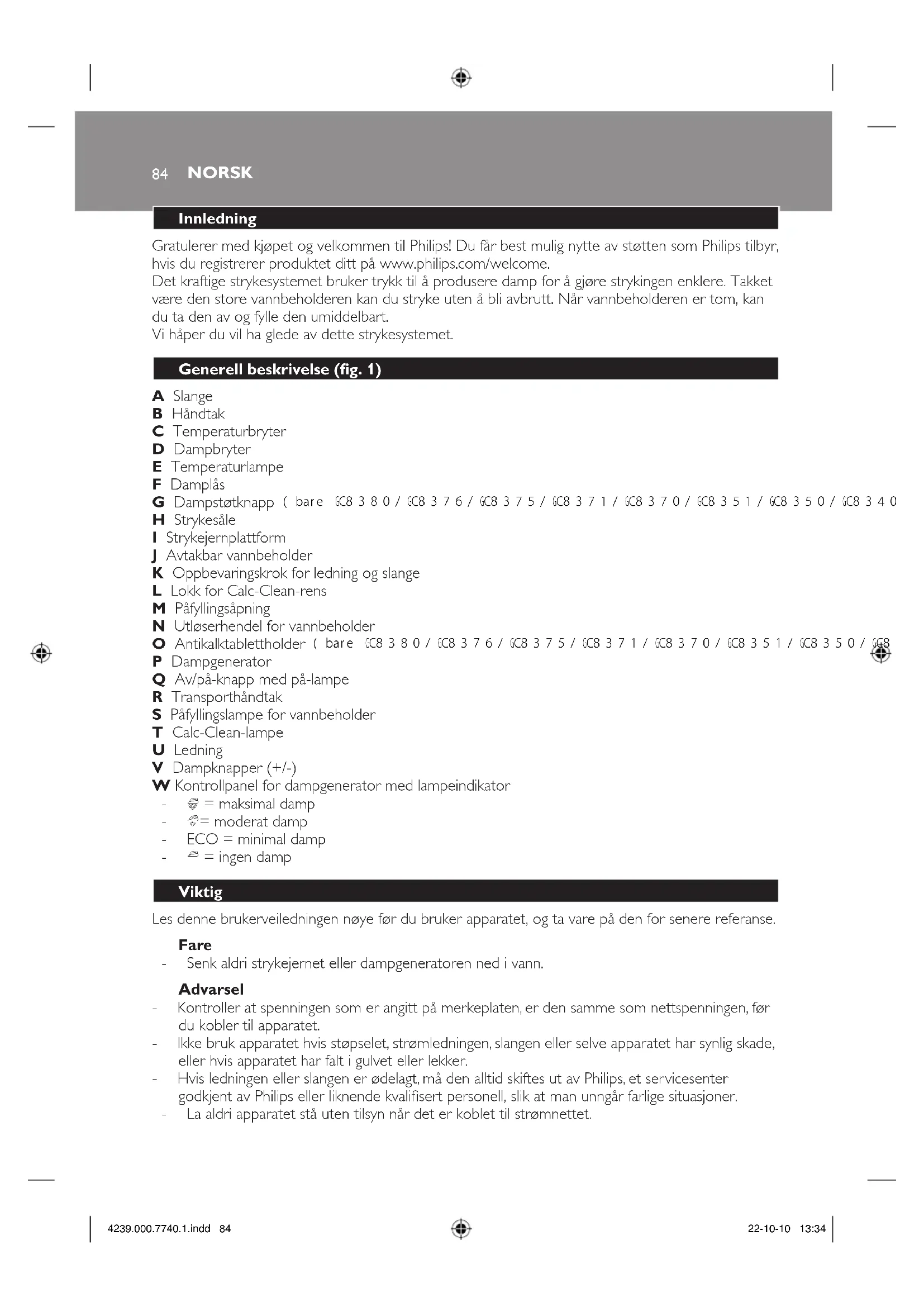 Gratulerer med kjøpet og velkommen til Philips! Du får best mulig nytte av støtten som Philips tilbyr, hvis du registrerer produktet ditt på www.philips.com/welcome. Det kraftige strykesystemet bruker trykk til å produsere damp for å gjøre strykingen enklere. Takket være den store vannbeholderen kan du stryke uten å bli avbrutt. Når vannbeholderen er tom, kan du ta den av og fylle den umiddelbart. Vi håper du vil ha glede av dette strykesystemet.