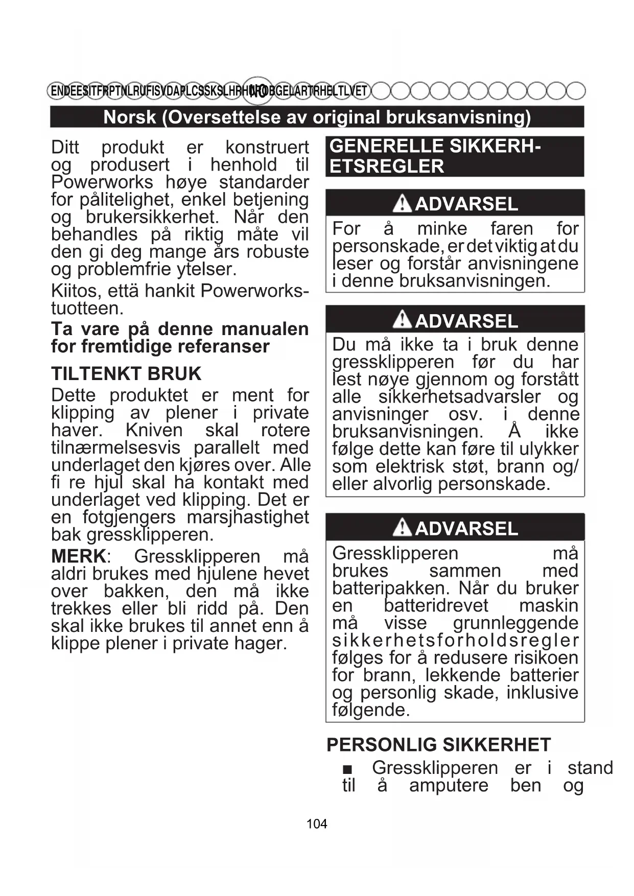 EN DE ES IT FR PT NL RU FI SV DA PL CS SK SL HR HU RO BG EL AR TR HE LT LV ET Ditt produkt er konstruert og produsert i henhold til Powerworks høye standarder for pålitelighet, enkel betjening og brukersikkerhet. Når den behandles på riktig måte vil den gi deg mange års robuste og problemfrie ytelser. Kiitos, että hankit Powerworks- tuotteen. Ta vare på denne manualen for fremtidige referanser TILTENKT BRUK Dette produktet er ment for klipping av plener i private haver. Kniven skal rotere tilnærmelsesvis parallelt med underlaget den kjøres over. Alle fi re hjul skal ha kontakt med underlaget ved klipping. Det er en fotgjengers marsjhastighet bak gressklipperen. MERK: Gressklipperen må aldri brukes med hjulene hevet over bakken, den må ikke trekkes eller bli ridd på. Den skal ikke brukes til annet enn å klippe plener i private hager. GENERELLE SIKKERH- ETSREGLER ADVARSEL For å minke faren for personskade, er det viktig at du leser og forstår anvisningene i denne bruksanvisningen. ADVARSEL Du må ikke ta i bruk denne gressklipperen før du har lest nøye gjennom og forstått alle sikkerhetsadvarsler og anvisninger osv. i denne bruksanvisningen. Å ikke følge dette kan føre til ulykker som elektrisk støt, brann og/ eller alvorlig personskade. ADVARSEL Gressklipperen må brukes sammen med batteripakken. Når du bruker en batteridrevet maskin må visse grunnleggende sikkerhetsforholdsregler følges for å redusere risikoen for brann, lekkende batterier og personlig skade, inklusive følgende. PERSONLIG SIKKERHET ■ Gressklipperen er i stand til å amputere ben og 104Norsk (Oversettelse av original bruksanvisning)