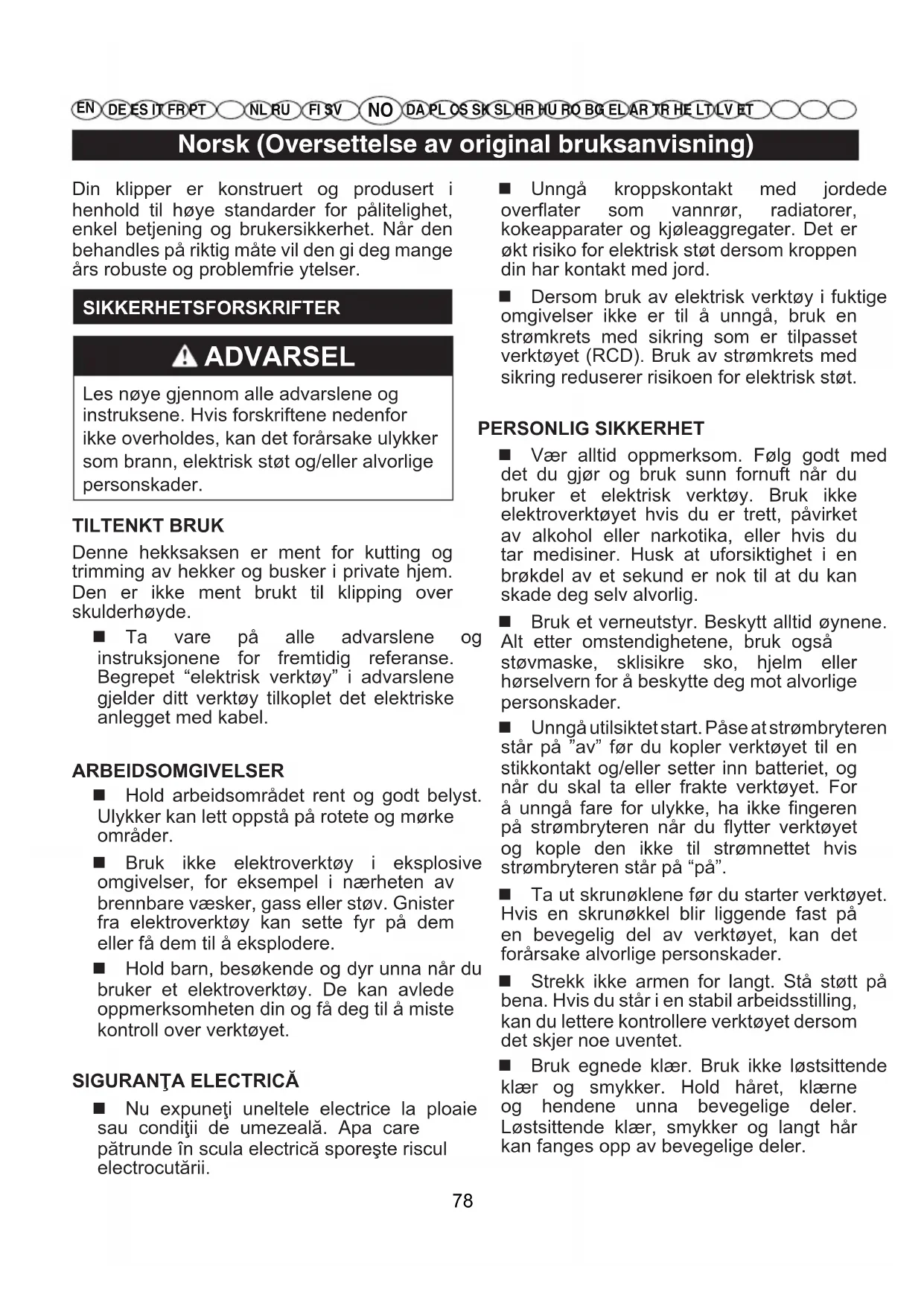 DA PL CS SK SL HR HU RO BG EL AR TR HE LT LV ET Din klipper er konstruert og produsert i henhold til høye standarder for pålitelighet, enkel betjening og brukersikkerhet. Når den behandles på riktig måte vil den gi deg mange års robuste og problemfrie ytelser. SIKKERHETSFORSKRIFTER ADVARSEL Les nøye gjennom alle advarslene og instruksene. Hvis forskriftene nedenfor ikke overholdes, kan det forårsake ulykker som brann, elektrisk støt og/eller alvorlige personskader. TILTENKT BRUK Denne hekksaksen er ment for kutting og trimming av hekker og busker i private hjem. Den er ikke ment brukt til klipping over skulderhøyde. Ta vare på alle advarslene og instruksjonene for fremtidig referanse. Begrepet “elektrisk verktøy” i advarslene gjelder ditt verktøy tilkoplet det elektriske anlegget med kabel. ARBEIDSOMGIVELSER Hold arbeidsområdet rent og godt belyst. Ulykker kan lett oppstå på rotete og mørke områder. Bruk ikke elektroverktøy i eksplosive omgivelser, for eksempel i nærheten av brennbare væsker, gass eller støv. Gnister fra elektroverktøy kan sette fyr på dem eller få dem til å eksplodere. Hold barn, besøkende og dyr unna når du bruker et elektroverktøy. De kan avlede oppmerksomheten din og få deg til å miste kontroll over verktøyet.