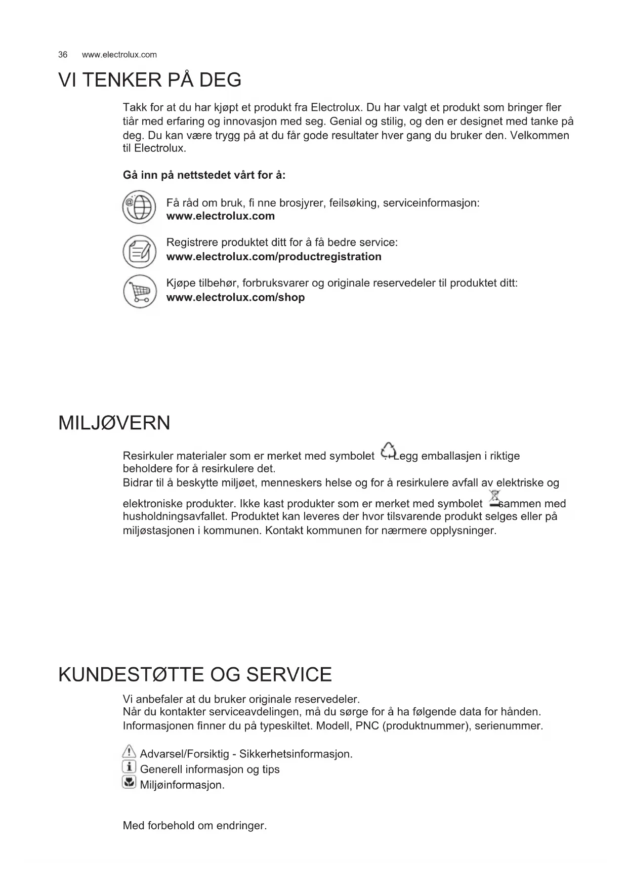 Vi anbefaler at du bruker originale reservedeler. Når du kontakter serviceavdelingen, må du sørge for å ha følgende data for hånden. Informasjonen fi nner du på typeskiltet. Modell, PNC (produktnummer), serienummer. Advarsel/Forsiktig - Sikkerhetsinformasjon. Generell informasjon og tips Miljøinformasjon. Med forbehold om endringer.