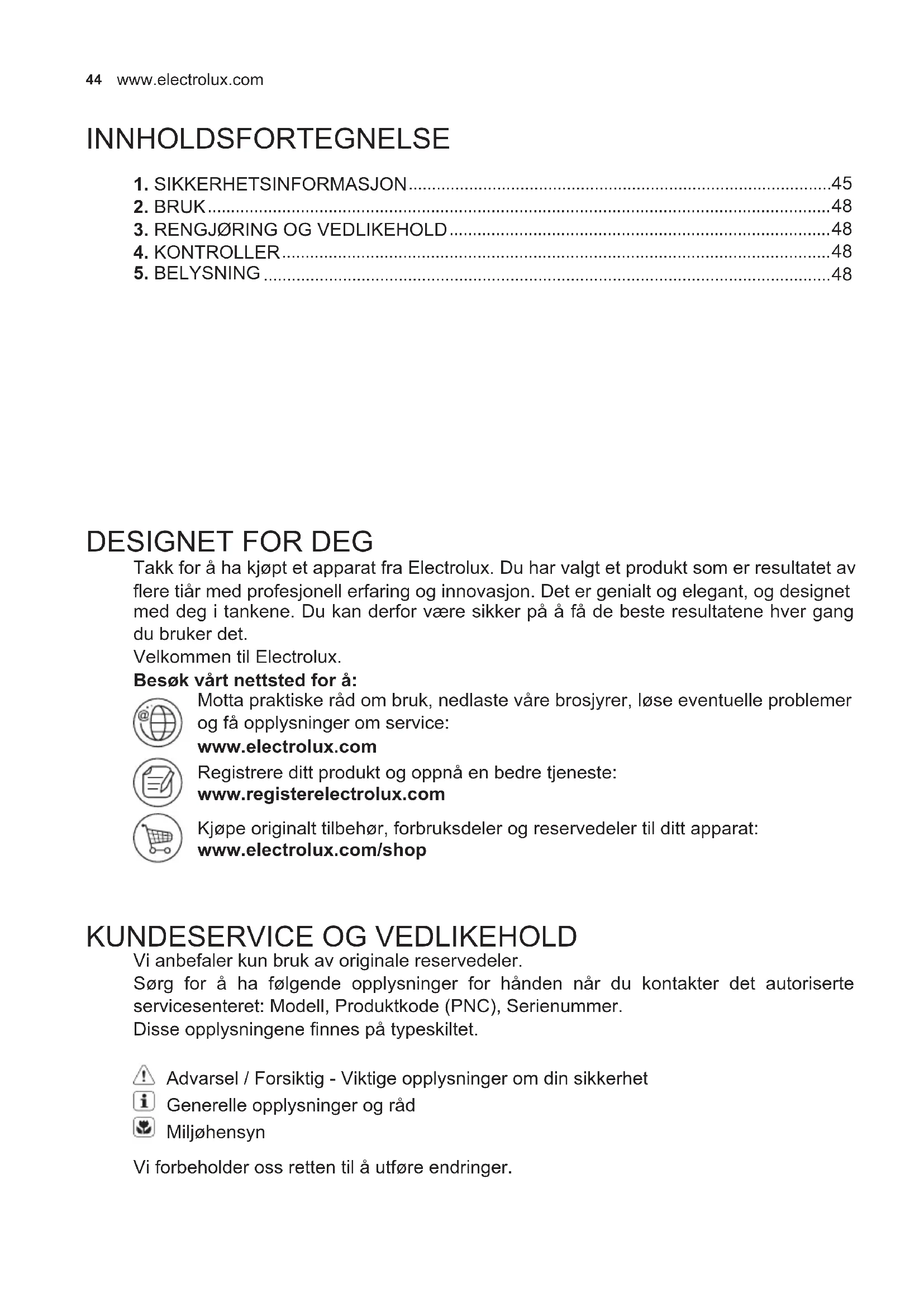 Vi anbefaler kun bruk av originale reservedeler. Sørg for å ha følgende opplysninger for hånden når du kontakter det autoriserte servicesenteret: Modell, Produktkode (PNC), Serienummer. Disse opplysningene nnes på typeskiltet. Advarsel / Forsiktig - Viktige opplysninger om din sikkerhet Generelle opplysninger og råd Miljøhensyn Vi forbeholder oss retten til å utføre endringer.45 NORWEGIAN