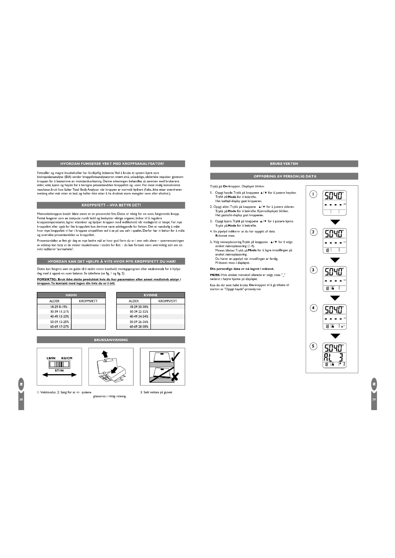Menneskekroppen består blant annet av en prosentdel fett. Dette er viktig for en sunn, fungerende kropp. Fettet fungerer som en støtpute rundt ledd og beskytter viktige organer, bidrar til å regulere kroppstemperaturen, lagrer vitaminer og hjelper kroppen med vedlikehold når matlageret er knapt. For mye kroppsfett eller også for lite kroppsfett kan derimot være ødeleggende for helsen. Det er vanskelig å måle hvor mye kroppsfett vi har i kroppen simpelthen ved å se på oss selv i speilet. Derfor har vi behov for å måle og overvåke prosentandelen av kroppsfett. Prosentandelen av fett gir deg et mye bedre mål av hvor god form du er i enn vekt alene – sammensetningen av vekttap kan bety at du mister muskelmasse i stedet for fett – du kan fortsatt være overvektig selv om en vekt indikerer ‘normalvekt’. KROPPSFETT – HVA BETYR DET? Dette kan fungere som en guide til å endre enten kosthold, treningsprogram eller væskeinntak for å hjelpe deg med å oppnå en sunn balanse. Se tabellene (se fig. 1 og fig. 2). FORSIKTIG: Bruk ikke dette produktet hvis du har pacemaker eller annet medisinsk utstyr i kroppen.Ta kontakt med legen din hvis du er i tvil. HVORDAN KAN DET HJELPE Å VITE HVOR MYE KROPPSFETT DU HAR?