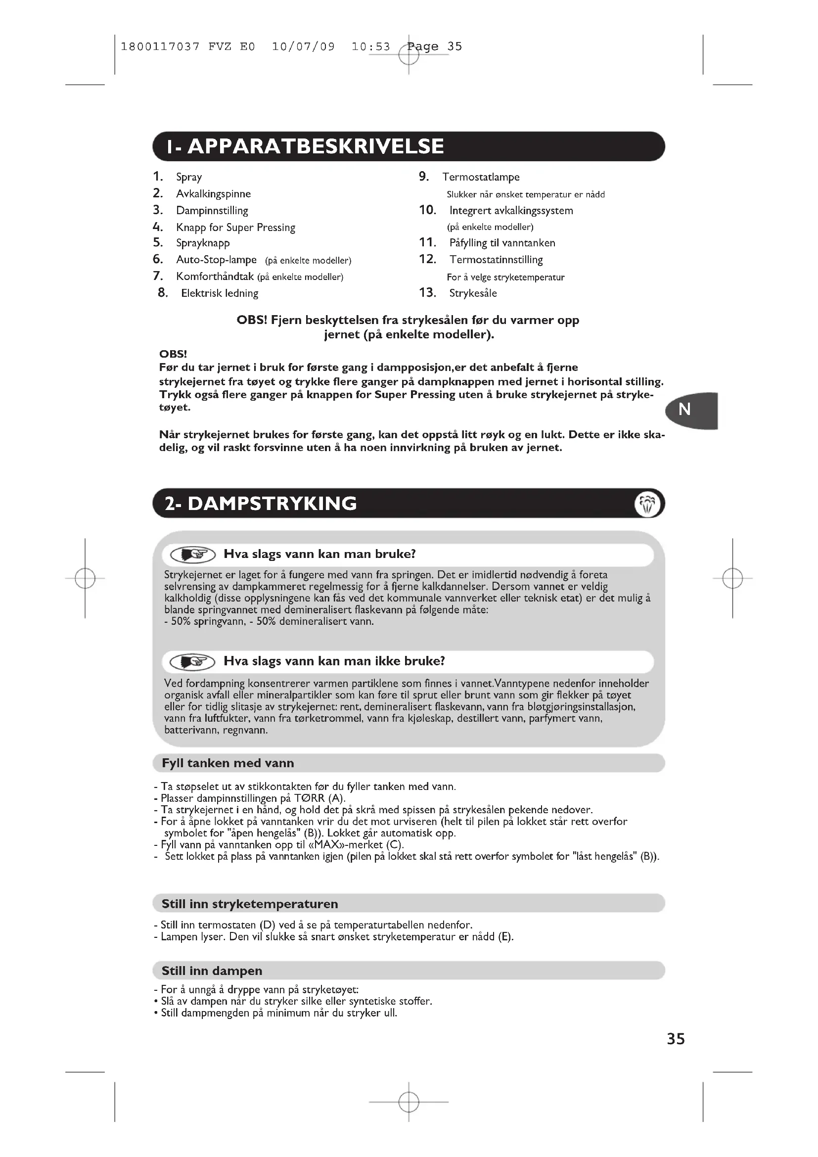 = DAMPSONE RÅD :Tekstiler og stryketemperaturer:• Strykejernet varmes raskt opp: begynn derfor med de tekstilene som skal strykes på lave temperaturer,og avslutt med de som kan tåle høyere temperaturer.• Hvis du senker termostaten, vent med å stryke til lampen lyser på nytt.• Dersom du skal stryke blandingsstoffer: still stryketemperaturen inn etter det fiberet som krever den laveste temperaturen. Hvilken temperatur og dampmengde? LIN MAX - Når du stryker enten med eller uten damp kan du trykke flere ganger på Spray knappen for å fukte tøyet (F), og dermed slette ut stive bretter.- Sjekk at det er vann i vanntanken før du trykker på knappen. Fukte tøyet (spray) - Heng plagget på en kleshenger, og strekk stoffet lett. Da dampen er veldig varm, må du alltid glatte tøyet på en kleshenger og aldri på en person.- Sett termostatinnstillingen på MAX. (H).- Trykk opp og ned på knappen for Super Pressing( ) (I), og beveg strykejernet oppover og nedover plagget. Se tegning (J).- Hold strykejernet på noen centimeters avstand for å ikke brenne sarte stoffer.- Trykk av og til på knappen for Super Pressing (G).- La det gå noen sekunder mellom hver gang du trykker på denne knappen. Større dampmengde Vertikal tøyglatting - Strykejernet er utstyrt med et integrert avkalkingssystem (K).- Dette systemet gir:• bedre strykekvalitet: konstant dampmengde så lenge du stryker• strykeytelse som varer lenge. Integrert avkalkingssystem (på enkelte modeller) - Det elektroniske systemet bryter strømtilførselen til strykejernet, og lampen for auto-stopp blinker dersom jernet blir stående mer enn 8 minutter på høykant eller mer enn 30 sekunder vannrett på sålen (L).- Strømtilførselen gjenopprettes ved å riste lett i jernet helt til lampen slutter å blinke.NB !Det er normalt at termostatlampen er slukket når auto-stopp er i funksjon. Auto-Stop (på enkelte modeller) - Vanntilførselen brytes automatisk når temperaturen på strykejernet ikke er høy nok for å produserdamp for å unngå at strykesålen drypper.Når du tar i bruk jernet for første gang, vent 2 minutter for å få damp. Anti-drypp-funksjon (på enkelte modeller)