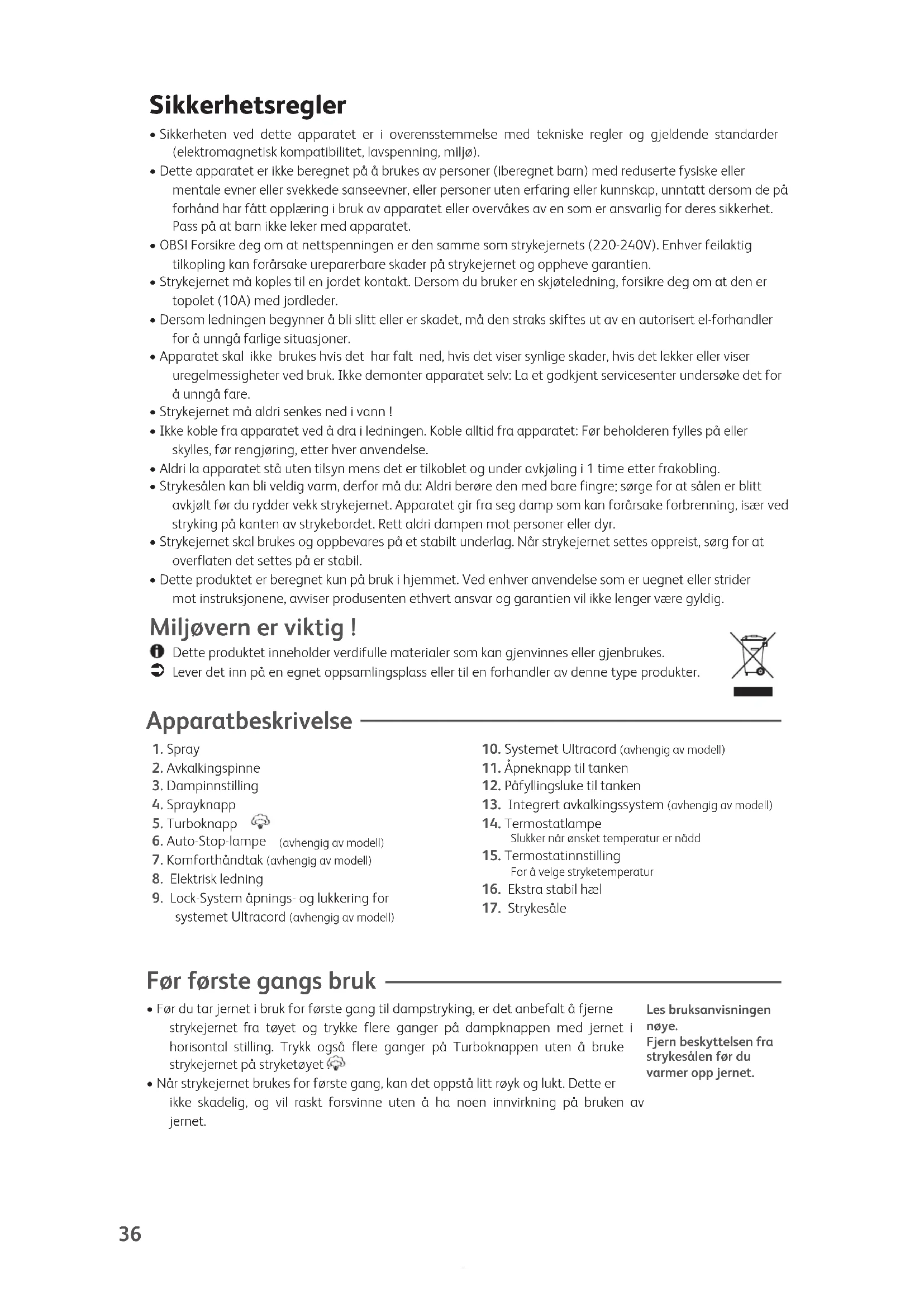 - Når strykejernet brukes for første gang, kan det oppstå litt røyk og lukt. Dette er ikke skadelig, og vil raskt forsvinne uten å ha noen innvirkning på bruken av jernet. Les bruksanvisningennøye.Fjern beskyttelsen frastrykesålen før duvarmer opp jernet. Sikkerhetsregler