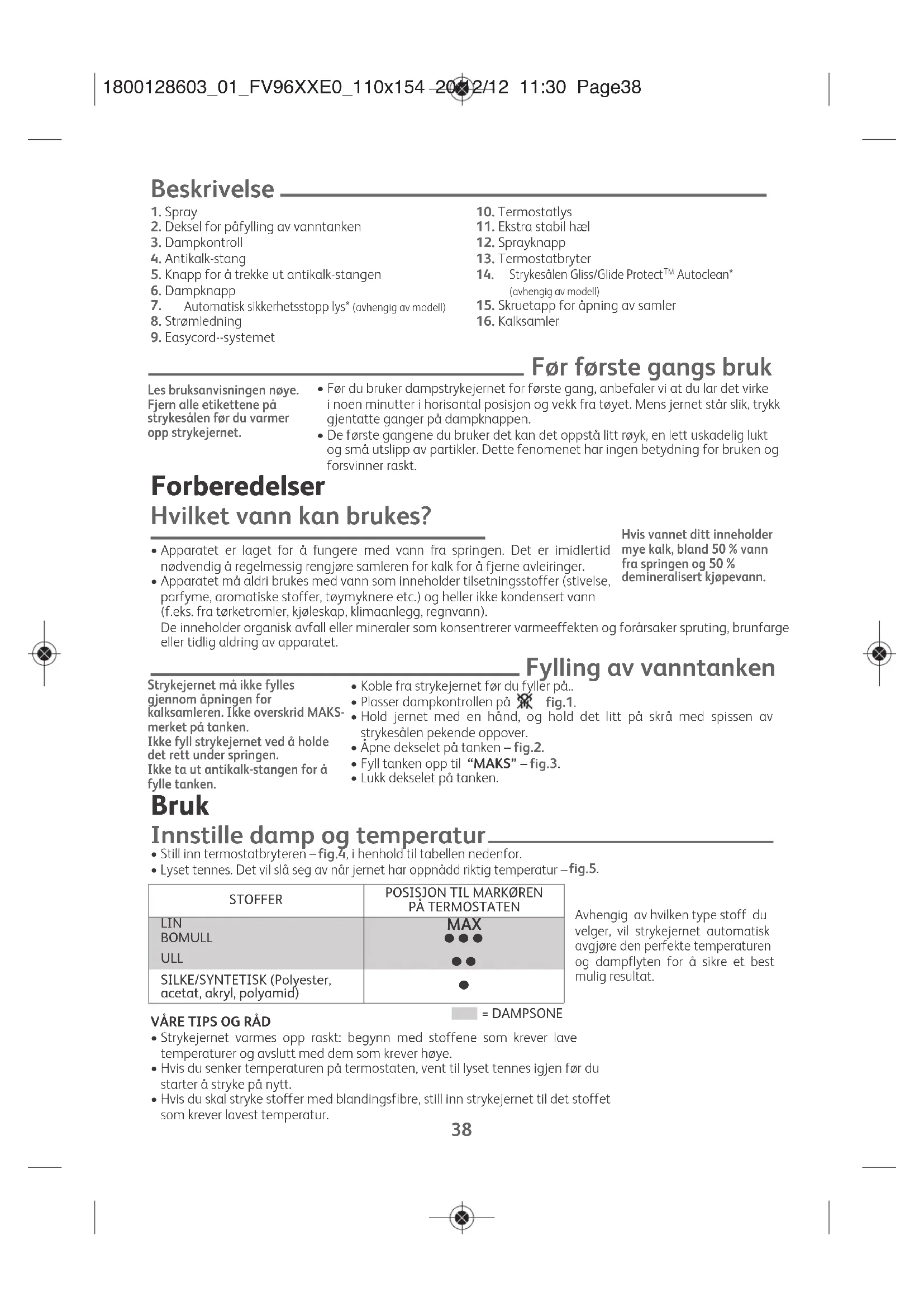 - Rull strømledningen rundt bøylen bak på jernet. Oppbevar strykejernet stående på hælen – fig.24. Advarsel! Bruk av slipende svamper skader det selvrensende belegget (avhengig av modell) på strykesålen – fig. 22. Advarsel! - Aldri rør enden på stangen – fig. 18. - Strykejernet fungerer ikke uten antikalk- stangen. Advarsel! Strykejernet fungerer ikke uten kalksamleren. Ikke bruk aggressive eller slipende produkter. 1800128603_01_FV96XXE0_110x154 20/12/12 11:30 Page40PROBLEM MULIGE ÅRSAKER LØSNINGER Vann renner ut gjennom hullene i strykesålen. Du bruker dampfunksjonen før jernet er varmt nok. Vent til lyset slukker. Du bruker dampknappen for ofte. Vent noen sekunder mellom hvert trykk. Du har lagret strykejernet flatt uten å tømme tanken og uten å plassere dampknappen på . Se kapittelet «Oppbevaring av strykejernet». Antikalk-stangen er ikke riktig plassert. Sett antikalk-stangen på plass igjen, og trykk den inn til du hører et klikk. Du har helt vann i kammeret for oppsamling av kalk. Aldri hell vann i kammeret for oppsamling av kalk. Brun farge kommer ut av strykesålen og flekker tøyet. Du har brukt kjemiske kalkfjerningsmidler. Aldri tilsett noen typer kalkfjerningsmidler i vanntanken. Du har ikke brukt riktig type vann. Gjennomfør en automatisk rengjøring, og se kapittelet «Hvilket vann kan brukes?" Fibrer fra tøyet har samlet seg opp i hullene på strykesålen og brenner. Gjennomfør en automatisk rengjøring. Rengjør strykesålen med en svamp som ikke inneholder metaller. Støvsug hullene i strykesålen fra tid til annen. Strykesålen er skitten eller brun og kan flekke tøyet. Du bruker for høy temperatur. Rengjør strykesålen som forklart ovenfor. Se tabellen for temperaturer og still inn termostaten. Tøyet er ikke tilstrekkelig rengjort eller du bruker stivelse. Rengjør strykesålen som forklart ovenfor. Spray stivelse på motsatt side enn den som strykes. Strykejernet produserer lite eller ingen damp. Tanken er tom. Fyll den. Antikalk-stangen er skitten. Rengjør antikalk-stangen. Strykejernet er fullt av kalk. Rengjør antikalk-stangen og gjennomfør en automatisk rengjøring. Strykejernet har blitt brukt uten damp for lenge. Gjennomfør en automatisk rengjøring. Strykesålen er stripet eller skadet. Du har plassert strykejernet flatt på et metallbrett. Du har rengjort strykesålen med en slipende svamp eller stålull. Alltid plasser strykejernet på hælen. Se kapittelet «Rengjøring av strykesålen». Strykesålen avgir partikler. Strykesålen begynner å bli full av kalk. Gjennomfør rengjøring og vedlikehold som forklart i denne bruksanvisningen. Vann renner ut gjennom dekselet på tanken. Du har ikke lukket dekselet skikkelig. Kontroller at dekselet på tanken er riktig lukket. Strykejernet produserer damp ved fylling av tanken. Markøren for dampknappen er ikke i posisjon . Kontroller at dampknappen er i posisjon . Sprayen sprayer ikke vann. Tanken er ikke full nok. Fyll tanken med vann. Vann renner ut på enden av strykejernet. Samleren for kalk er ikke plassert riktig. Sett samleren riktig på plass.