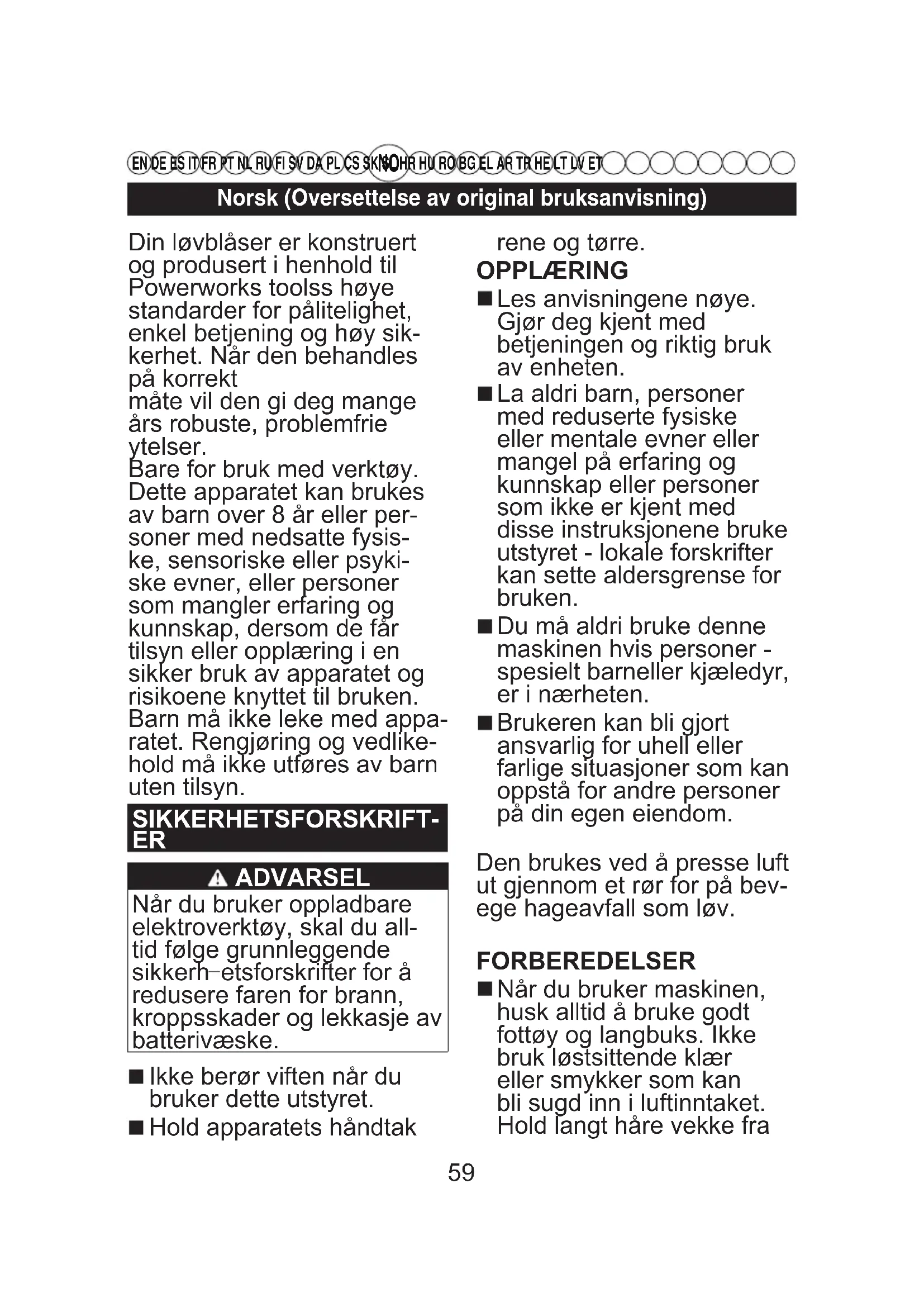 EN DE ES IT FR PT NL RU FI SV DA PL CS SK SL HR HU RO BG EL AR TR HE LT LV ET Din løvblåser er konstruert og produsert i henhold til Powerworks toolss høye standarder for pålitelighet, enkel betjening og høy sik- kerhet. Når den behandles på korrekt måte vil den gi deg mange års robuste, problemfrie ytelser. Bare for bruk med verktøy. Dette apparatet kan brukes av barn over 8 år eller per- soner med nedsatte fysis- ke, sensoriske eller psyki- ske evner, eller personer som mangler erfaring og kunnskap, dersom de får tilsyn eller opplæring i en sikker bruk av apparatet og risikoene knyttet til bruken. Barn må ikke leke med appa- ratet. Rengjøring og vedlike- hold må ikke utføres av barn uten tilsyn. SIKKERHETSFORSKRIFT-