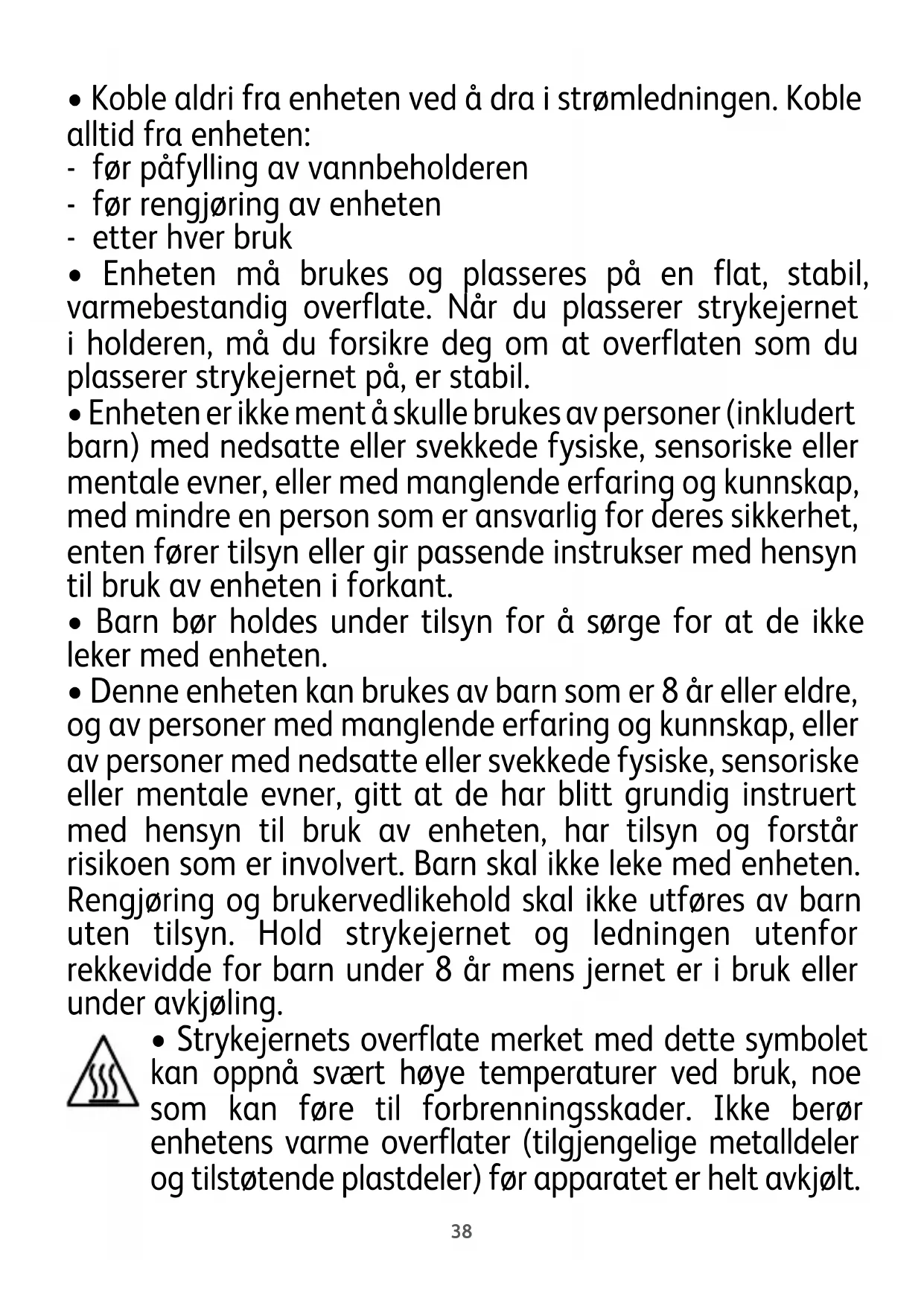 - Strykejernets overflate merket med dette symbolet kan oppnå svært høye temperaturer ved bruk, noe som kan føre til forbrenningsskader. Ikke berør enhetens varme overflater (tilgjengelige metalldeler og tilstøtende plastdeler) før apparatet er helt avkjølt.39