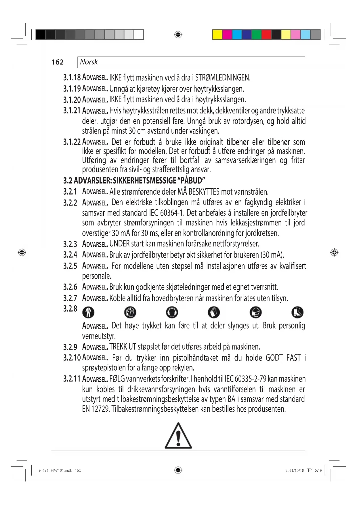 På maskinen og i bruksanvisningen finnes kun de symbolene som gjelder maskinen som er kjøpt. Kontroller at symbolene og skiltene festet på maskinen alltid er hele og leselige. Hvis ikke, må de skiftes ut og henges opp på samme plass. Advarsel - fare Les disse instruksjonene nøye før bruk. Ikon E3 (hvis symbolet finnes på fig. 1) - Viser at maskinen ikke er til profesjonelt bruk (hjemmebruk). Maskinen skal ikke brukes av barn eller personer med nedsatte fysiske, sensoriske eller psykiske evner, eller av personer uten erfaring eller kjennskap til maskinen med mindre de får tilsyn eller opplæring i en sikker bruk av maskinen og risikoene knyttet til bruken. Deler i bevegelse. Ikke berør. 0 Posisjon for bryter slått av I Posisjon for bryter slått på Garantert lydeffektnivå Forbud: Varsler brukeren om at landets gjeldende regelverk kan forby tilkoblingen av maskinen til drikkevannsforsyningen. 94694_HW101.indb 15994694_HW101.indb 159 2021/10/18 下午5:192021/10/18 下午5:19160 Norsk Fare: Varsler brukeren om at vannstrålen ikke skal rettes mot barn, dyr, elektrisk utstyr eller selve maskinen. Maskinen er i isolasjonsklasse II. Det betyr at den har en forsterket isolasjon eller er dobbeltisolert (kun hvis symbolet finnes på maskinen). Maskinen er i samsvar med anvendbare europeiske direktiver. Ikon E1 - Viser påbudet om ikke å avhende høytrykksvaskeren som vanlig husholdningsavfall. Den kan leveres inn til forhandleren ved kjøp av en ny. Maskinens elektriske og elektroniske deler må ikke brukes om igjen til feil bruk, fordi de kan være helseskadelige. Kun for EU-land På grunn av forekomst av farlige komponenter i utstyret, kan brukt elektrisk og elektronisk utstyr ha en negativ innvirkning på miljøet og menneskers helse. Ikke kast elektriske og elektroniske apparater sammen med husholdningsavfall! I samsvar med det europeiske direktivet om avfall fra elektrisk og elektronisk utstyr og dettes tilpasning til nasjonal lovgivning, skal brukt elektrisk og elektronisk utstyr samles inn separat og leveres til et eget innsamlingssted for kommunalt avfall, som driver virksomhet i samsvar med miljøvernforskriftene. Dette er angis av symbolet med den overkryssede avfallsbeholderen som er plassert på utstyret. Bruk hørselsvern. Bruk vernemaske. Bruk åndedrettsvern. Bruk vernehansker. Bruk vernesko. Bruk verneklær. 94694_HW101.indb 16094694_HW101.indb 160 2021/10/18 下午5:192021/10/18 下午5:19161 Norsk