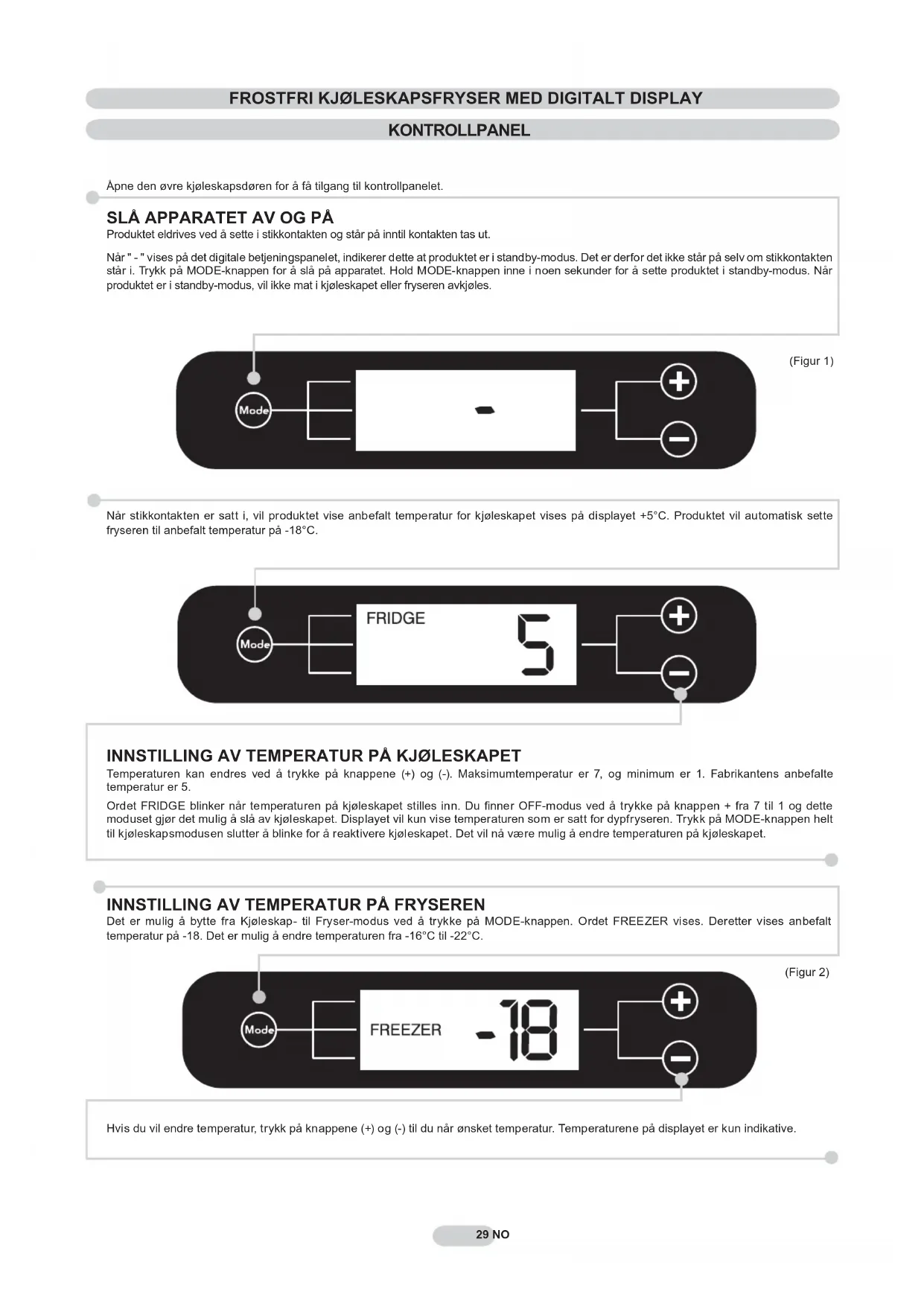 Produktet eldrives ved å sette i stikkontakten og står på inntil kontakten tas ut. Når " - " vises på det digitale betjeningspanelet, indikerer dette at produktet er i standby-modus. Det er derfor det ikke står på selv om stikkontakten står i. Trykk på MODE-knappen for å slå på apparatet. Hold MODE-knappen inne i noen sekunder for å sette produktet i standby-modus. Når produktet er i standby-modus, vil ikke mat i kjøleskapet eller fryseren avkjøles.