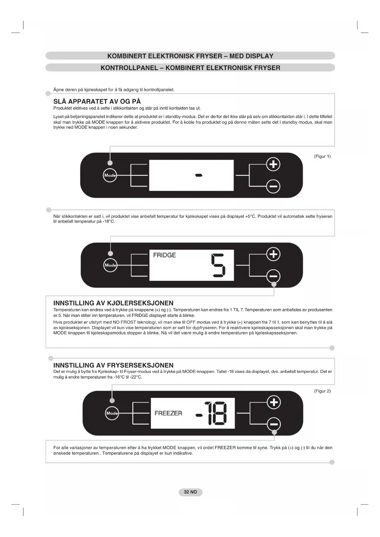 Det er mulig å bytte fra Kjøleskap- til Fryser-modus ved å trykke på MODE-knappen. Tallet -18 vises da displayet, dvs. anbefalt temperatur. Det er mulig å endre temperaturen fra -16°C til -22°C. For alle variasjoner av temperaturen etter å ha trykket MODE knappen, vil ordet FREEZER komme til syne. Trykk på (+) og (-) til du når den ønskede temperaturen.. Temperaturene på displayet er kun indikative. (Figur 1) (Figur 2) 32 IT 32 NO Når stikkontakten er satt i, vil produktet vise anbefalt temperatur for kjøleskapet vises på displayet +5°C. Produktet vil automatisk sette fryseren til anbefalt temperatur på -18°C.33 IT 33 NO