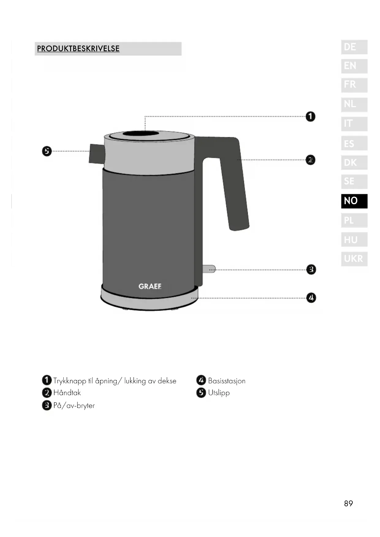 UKR GENERELLE SIKKERHETSINSTRUKSER Dette apparatet oppfyller de foreskrevne sikkerhetsbestemmelsene. Us- akkyndig bruk kan likevel føre til personskader og materielle skader. Overhold følgende sikkerhetsanvisninger for en sikker omgang med ap- paratet: ● Kontroller apparatet for ytre synlige skader på hus, strømledning og -støpsel før bruk. Ta aldri et skadet apparat i bruk. ● Reparasjoner må bare utføres av en fagperson eller av Graefs kunde- service. Feilaktige reparasjoner kan utsette brukeren for store farer. I tillegg ugyldiggjøres krav på garantiytelser. ● Defekte komponenter skal kun skiftes ut med originale reservedeler. Kun med disse delene kan det garanteres at sikkerhetskravene oppfylles. ● Denne enheten må ikke brukes av barn. Apparatet og apparatets strømledning må holdes unna barn. ● Barn skal holdes under tilsyn for å sikre at de ikke leker med apparatet. ● Denne enheten kan også brukes av personer med reduserte fysiske, sensoriske eller mentale evner eller med mangel på erfaring og/eller kunnskap, hvis de er under oppsyn eller har blitt instruert i sikker bruk av enheten og har forstått farene som oppstår ved det.. ● Apparatet er ikke beregnet til bruk med et eksternt tidsur eller en sepa- rat fjernkontroll. ● Strømledningen skal alltid trekkes ut fra stikkontakten etter støpselet, ikke etter strømledningen. ● Ikke bruk apparatet hvis strømledningen eller støpselet er skadet. ● Forhindre at det kommer væske på støpselet. ● Hvis tilkoblingsledningen er skadet, skal den, for å unngå farer, kun skif- tes ut av produsenten, kundeservice eller en lignende kvalifisert person. ● Huset på apparatet må ikke under noen omstendigheter åpnes. Hvis spenningsførende tilkoblinger berøres og den elektriske og mekaniske oppbygningen forandres, er det fare for elektrisk støt. ● Berør aldri deler som står under spenning. Dette kan føre til elektrisk støt og til og med døden.92 ● Sammenlign tilkoblingsinformasjonen (spenning og frekvens) på types- kiltet med den for strømnettet før du kobler til apparatet. Disse opplys- ningene må samsvare, slik at apparatet ikke blir skadet. ● Forsikre deg om at strømkabelen ligger som den skal. Enheten kan falle av arbeidsflaten hvis den blir fanget på kabelen. ● Pakningsmaterialer skal ikke brukes til å leke med. Det er fare for kvel- ning. ● Bruk aldri apparatet i nærheten av en varmekilde. ● Bruk aldri apparatet utendørs og oppbevar det på et tørt sted. ● Støpselet må fjernes fra stikkontakten ved påfylling av vann, etter hver bruk og før hver rengjøring. ● Ikke hell væske på kontakten til basestasjonen. ● Ikke fyll vannkokeren med vann til over maks-markeringen. En mulig oversprut av vann kan føre til personskader. ● Unngå berøringer med ytre vegg på apparatet, denne kan bli svært varm. ● Forsiktig, apparatet blir svært varmt. Skåldefare på grunn av damp og restvarme som kommer ut. ● Grip kun apparatet etter håndtaket. ● Se til at det alltid finnes tilstrekkelig med vann i apparatet (bunnen skal være tildekket) for å unngå en tørrkoking. ● Pass på at apparatet kun brukes i forbindelse med medfølgende base- stasjon. Bruk aldri basestasjonen til andre formål. ● Slå på apparatet først etter at du har fylt på vann. ● Ikke bruk aggressive eller skurende rengjøringsmidler, og heller ikke løsemidler. ● Ikke skrap av vanskelige tilsmussinger med harde gjenstander. ● Rengjør aldri apparatet og basestasjonen under rennende vann, og senk det aldri ned i vann.93