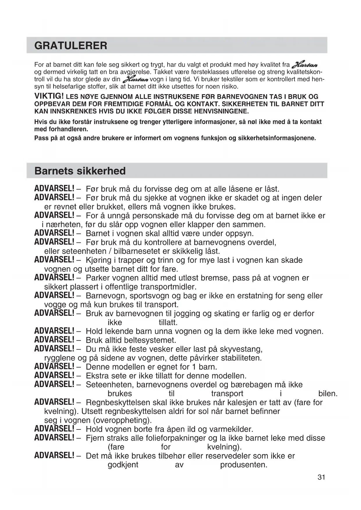 8GRATULERER For at barnet ditt kan føle seg sikkert og trygt, har du valgt et produkt med høy kvalitet fra og dermed virkelig tatt en bra avgjørelse. Takket være førsteklasses utførelse og streng kvalitetskon- troll vil du ha stor glede av din vogn i lang tid. Vi bruker tekstiler som er kontrollert med hen- syn til helsefarlige stoffer, slik at barnet ditt ikke utsettes for noen risiko. VIKTIG! LES NØYE GJENNOM ALLE INSTRUKSENE FØR BARNEVOGNEN TAS I BRUK OG OPPBEVAR DEM FOR FREMTIDIGE FORMÅL OG KONTAKT. SIKKERHETEN TIL BARNET DITT KAN INNSKRENKES HVIS DU IKKE FØLGER DISSE HENVISNINGENE. Hvis du ikke forstår instruksene og trenger ytterligere informasjoner, så nøl ikke med å ta kontakt med forhandleren. Pass på at også andre brukere er informert om vognens funksjon og sikkerhetsinformasjonene. ADVARSEL! – Før bruk må du forvisse deg om at alle låsene er låst. ADVARSEL! – Før bruk må du sjekke at vognen ikke er skadet og at ingen deler er revnet eller brukket, ellers må vognen ikke brukes. ADVARSEL! – For å unngå personskade må du forvisse deg om at barnet ikke er i nærheten, før du slår opp vognen eller klapper den sammen. ADVARSEL! – Barnet i vognen skal alltid være under oppsyn. ADVARSEL! – Før bruk må du kontrollere at barnevognens overdel, eller seteenheten / bilbarnesetet er skikkelig låst. ADVARSEL! – Kjøring i trapper og trinn og for mye last i vognen kan skade vognen og utsette barnet ditt for fare. ADVARSEL! – Parker vognen alltid med utløst bremse, pass på at vognen er sikkert plassert i offentlige transportmidler. ADVARSEL! – Barnevogn, sportsvogn og bag er ikke en erstatning for seng eller vogge og må kun brukes til transport. ADVARSEL! – Bruk av barnevognen til jogging og skating er farlig og er derfor ikke tillatt. ADVARSEL! – Hold lekende barn unna vognen og la dem ikke leke med vognen. ADVARSEL! – Bruk alltid beltesystemet. ADVARSEL! – Du må ikke feste vesker eller last på skyvestang, rygglene og på sidene av vognen, dette påvirker stabiliteten. ADVARSEL! – Denne modellen er egnet for 1 barn. ADVARSEL! – Ekstra sete er ikke tillatt for denne modellen. ADVARSEL! – Seteenheten, barnevognens overdel og bærebagen må ikke brukes til transport i bilen. ADVARSEL! – Regnbeskyttelsen skal ikke brukes når kalesjen er tatt av (fare for kvelning). Utsett regnbeskyttelsen aldri for sol når barnet befinner seg i vognen (overoppheting). ADVARSEL! – Hold vognen borte fra åpen ild og varmekilder. ADVARSEL! – Fjern straks alle folieforpakninger og la ikke barnet leke med disse (fare for kvelning). ADVARSEL! – Det må ikke brukes tilbehør eller reservedeler som ikke er godkjent av produsenten. Barnets sikkerhed