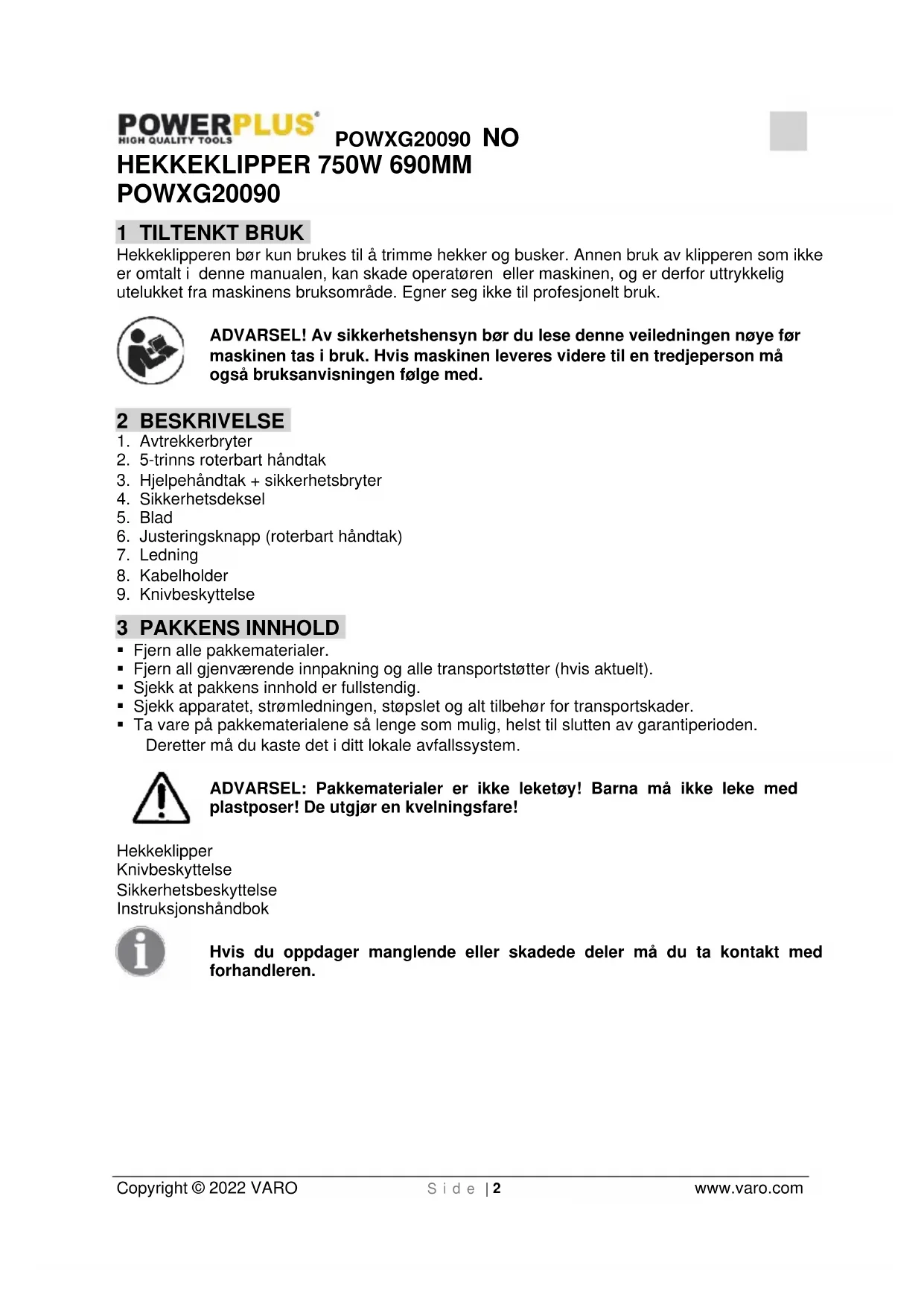 - Hold alle kroppsdeler unna knivene. Ikke forsøk å fjerne kuttet materiale eller å holde i materialet som skal kuttes når knivene beveger seg. Påse at bryteren er slått av når du skal fjerne fastklemte materialer. Et øyeblikks uoppmerksomhet ved bruk av hekkeklipperen kan føre til alvorlige personskader.POWXG20090 NO Copyright © 2022 VARO S i d e | 5 www.varo.com