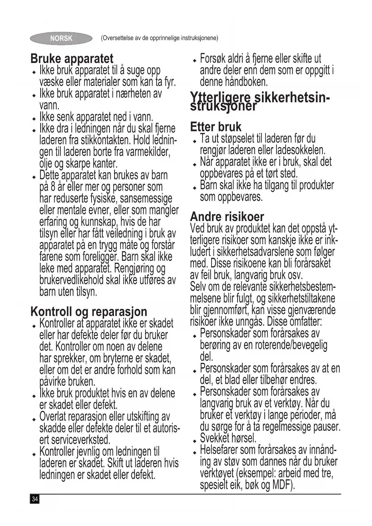 Advarsel! Når du bruker bat- teridrevne apparater, må du ta grunnleggende sikkerhetsforhold- sregler, blant annet dem som er beskrevet nedenfor, for å redusere risikoen for brann, batterilekkasje, personskade og skade på materi- ell. Les hele håndboken nøye før du bruker apparatet. Beregnet bruk er beskrevet i denne håndboken. Hvis du bruker annet tilbehør, kobler til annet utstyr eller bruker dette produktet til andre opp- gaver enn det som er anbefalt i denne håndboken, kan det føre til fare for personskade. Ta vare på denne håndboken for frem- tidig bruk.34 (Oversettelse av de opprinnelige instruksjonene) NORSK Bruke apparatet Ikke bruk apparatet til å suge opp væske eller materialer som kan ta fyr. Ikke bruk apparatet i nærheten av vann. Ikke senk apparatet ned i vann. Ikke dra i ledningen når du skal fjerne laderen fra stikkontakten. Hold lednin- gen til laderen borte fra varmekilder, olje og skarpe kanter. Dette apparatet kan brukes av barn på 8 år eller mer og personer som har reduserte fysiske, sansemessige eller mentale evner, eller som mangler erfaring og kunnskap, hvis de har tilsyn eller har fått veiledning i bruk av apparatet på en trygg måte og forstår farene som foreligger. Barn skal ikke leke med apparatet. Rengjøring og brukervedlikehold skal ikke utføres av barn uten tilsyn. Kontroll og reparasjon Kontroller at apparatet ikke er skadet eller har defekte deler før du bruker det. Kontroller om noen av delene har sprekker, om bryterne er skadet, eller om det er andre forhold som kan påvirke bruken. Ikke bruk produktet hvis en av delene er skadet eller defekt. Overlat reparasjon eller utskifting av skadde eller defekte deler til et autoris- ert serviceverksted. Kontroller jevnlig om ledningen til laderen er skadet. Skift ut laderen hvis ledningen er skadet eller defekt. Forsøk aldri å fjerne eller skifte ut andre deler enn dem som er oppgitt i denne håndboken. Ytterligere sikkerhetsin- struksjoner Etter bruk Ta ut støpselet til laderen før du rengjør laderen eller ladesokkelen. Når apparatet ikke er i bruk, skal det oppbevares på et tørt sted. Barn skal ikke ha tilgang til produkter som oppbevares. Andre risikoer Ved bruk av produktet kan det oppstå yt- terligere risikoer som kanskje ikke er ink- ludert i sikkerhetsadvarslene som følger med. Disse risikoene kan bli forårsaket av feil bruk, langvarig bruk osv. Selv om de relevante sikkerhetsbestem- melsene blir fulgt, og sikkerhetstiltakene blir gjennomført, kan visse gjenværende risikoer ikke unngås. Disse omfatter: Personskader som forårsakes av berøring av en roterende/bevegelig del. Personskader som forårsakes av at en del, et blad eller tilbehør endres. Personskader som forårsakes av langvarig bruk av et verktøy. Når du bruker et verktøy i lange perioder, må du sørge for å ta regelmessige pauser. Svekket hørsel. Helsefarer som forårsakes av innånd- ing av støv som dannes når du bruker verktøyet (eksempel: arbeid med tre, spesielt eik, bøk og MDF).35 (Oversettelse av de opprinnelige instruksjonene) NORSK Batterier og ladere Batterier