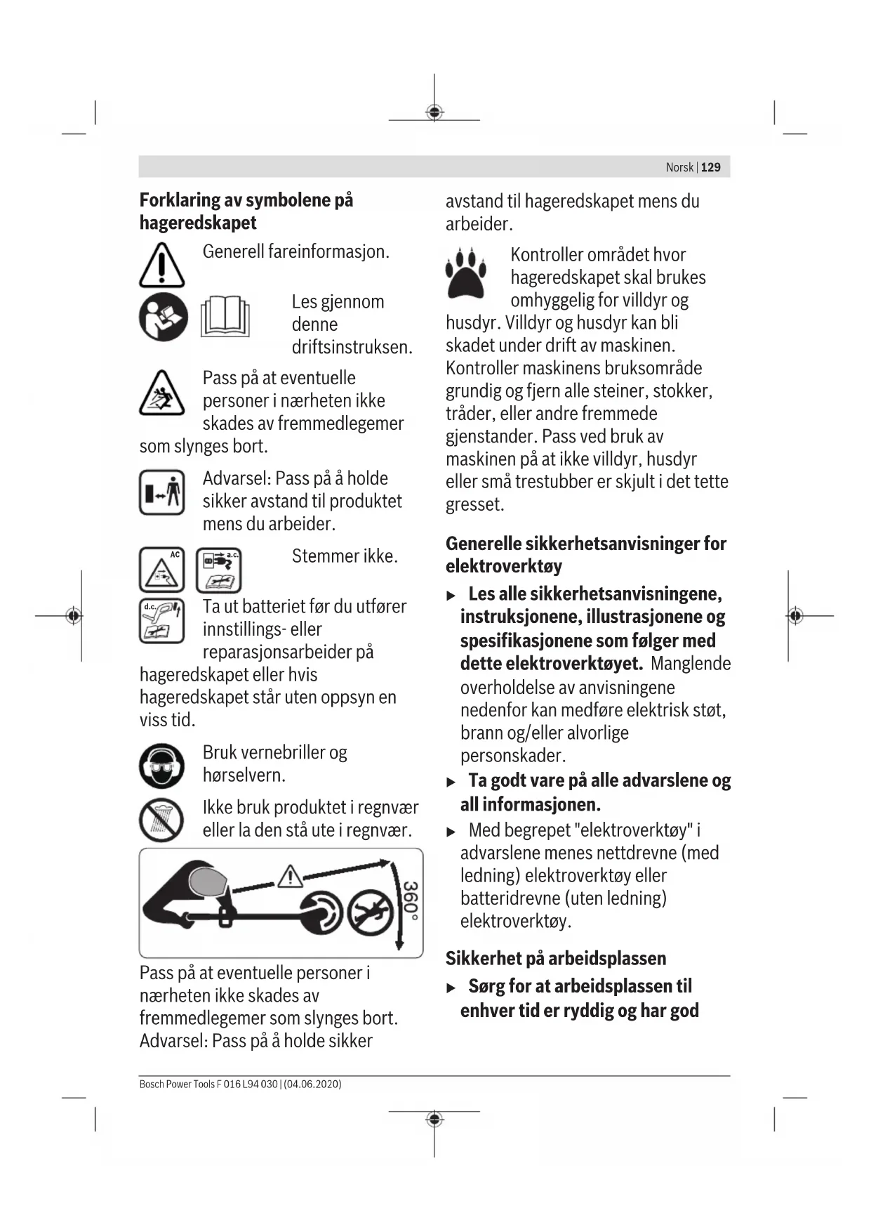 a.c. Stemmer ikke. d.c. Ta ut batteriet før du utfører innstillings- eller reparasjonsarbeider på hageredskapet eller hvis hageredskapet står uten oppsyn en viss tid. Bruk vernebriller og hørselvern. Ikke bruk produktet i regnvær eller la den stå ute i regnvær. Pass på at eventuelle personer i nærheten ikke skades av fremmedlegemer som slynges bort. Advarsel: Pass på å holde sikker avstand til hageredskapet mens du arbeider. Kontroller området hvor hageredskapet skal brukes omhyggelig for villdyr og husdyr. Villdyr og husdyr kan bli skadet under drift av maskinen. Kontroller maskinens bruksområde grundig og fjern alle steiner, stokker, tråder, eller andre fremmede gjenstander. Pass ved bruk av maskinen på at ikke villdyr, husdyr eller små trestubber er skjult i det tette gresset. Generelle sikkerhetsanvisninger for elektroverktøy u Les alle sikkerhetsanvisningene, instruksjonene, illustrasjonene og spesifikasjonene som følger med dette elektroverktøyet. Manglende overholdelse av anvisningene nedenfor kan medføre elektrisk støt, brann og/eller alvorlige personskader. u Ta godt vare på alle advarslene og all informasjonen. u Med begrepet "elektroverktøy" i advarslene menes nettdrevne (med ledning) elektroverktøy eller batteridrevne (uten ledning) elektroverktøy. Sikkerhet på arbeidsplassen u Sørg for at arbeidsplassen til enhver tid er ryddig og har god Bosch Power Tools F 016 L94 030 | (04.06.2020)130 | Norsk belysning. Rot eller dårlig lys innebærer stor fare for uhell. u Bruk ikke elektroverktøy i eksplosjonsfarlige omgivelser, for eksempel der det finnes brennbare væsker, gasser eller støv. Elektroverktøy lager gnister som kan antenne støv eller damp. u Hold barn og andre personer unna når et elektroverktøy brukes. Hvis du blir forstyrret under arbeidet, kan du miste kontrollen over elektroverktøyet. Elektrisk sikkerhet u Støpselet til elektroverktøyet må passe i stikkontakten. Støpselet må ikke endres på noen måte. Bruk ikke adapterstøpsler sammen med jordede elektroverktøy. Bruk av støpsler som ikke er forandret på og passende stikkontakter, reduserer risikoen for elektrisk støt. u Unngå kroppskontakt med jordede overflater som rør, radiatorer, komfyrer og kjøleskap. Det er større fare for elektrisk støt hvis kroppen din er jordet. u Elektroverktøy må ikke utsettes for regn eller fuktighet. Dersom det kommer vann i et elektroverktøy, øker risikoen for elektriske støt. u Ikke bruk ledningen til andre formål enn den er beregnet for. Bruk aldri ledningen til å bære eller trekke elektroverktøyet eller koble det fra strømforsyningen. Hold ledningen unna varme, olje, skarpe kanter eller deler som beveger seg. Med skadede eller sammenfiltrede ledninger øker risikoen for elektrisk støt. u Når du arbeider utendørs med et elektroverktøy, må du bruke en skjøteledning som er egnet for utendørs bruk. Når du bruker en skjøteledning som er egnet for utendørs bruk, reduseres risikoen for elektrisk støt. u Hvis det ikke kan unngås å bruke elektroverktøyet i fuktige omgivelser, må du bruke en jordfeilbryter. Bruk av en jordfeilbryter reduserer risikoen for elektrisk støt. Personsikkerhet u Vær oppmerksom, følg med på det du gjør og utvis sunn fornuft når du arbeider med et elektroverktøy. Ikke bruk elektroverktøy når du er trøtt eller er påvirket av alkohol eller andre rusmidler eller medikamenter. Et øyeblikks uoppmerksomhet ved bruk av elektroverktøyet kan føre til alvorlige personskader. u Bruk personlig verneutstyr. Bruk alltid øyebeskyttelse. Bruk av egnet personlig sikkerhetsutstyr som støvmaske, sklisikre arbeidssko, hjelm eller hørselvern reduserer risikoen for skader. F 016 L94 030 | (04.06.2020) Bosch Power ToolsNorsk | 131 u Unngå utilsiktet start. Forviss deg om at elektroverktøyet er slått av før du kobler det til strømkilden og/eller batteriet, løfter det opp eller bærer det. Hvis du holder fingeren på bryteren når du bærer elektroverktøyet eller kobler elektroverktøyet til strømmen i innkoblet tilstand, kan dette føre til uhell. u Fjern innstillingsverktøy eller skrunøkler før du slår på elektroverktøyet. Et verktøy eller en nøkkel som befinner seg i en roterende verktøydel, kan føre til personskader. u Unngå en unormal kroppsholdning. Sørg for å stå riktig og stødig. Dermed kan du kontrollere elektroverktøyet bedre i uventede situasjoner. u Bruk egnede klær. Ikke bruk vide klær eller smykker. Hold hår og klær unna deler som beveger seg. Løstsittende tøy, smykker eller langt hår kan komme inn i deler som beveger seg. u Hvis det kan monteres støvavsugs- og -oppsamlingsinnretninger, må du forvisse deg om at disse er tilkoblet og brukes riktig. Bruk av et støvavsug reduserer fare på grunn av støv. u Selv om du begynner å bli vant til å bruke verktøyet, må du ikke bli uoppmerksom og ignorere sikkerhetsreglene for verktøyet. En uforsiktig handling kan forårsake alvorlig personskade i løpet av et brøkdels sekund. Omhyggelig bruk og håndtering av elektroverktøy u Ikke overbelast elektroverktøyet. Bruk et elektroverktøy som er beregnet for arbeidsoppgaven. Med et passende elektroverktøy arbeider du bedre og sikrere i det angitte effektområdet. u Ikke bruk elektroverktøyet hvis av/på-bryteren er defekt. Et elektroverktøy som ikke lenger kan slås av eller på, er farlig og må repareres. u Trekk støpselet ut av strømkilden og/eller fjern batteriet (hvis demonterbart) før du utfører innstillinger på elektroverktøyet, skifter tilbehør eller legger bort maskinen. Disse tiltakene forhindrer en utilsiktet starting av elektroverktøyet. u Elektroverktøy som ikke er i bruk, må oppbevares utilgjengelig for barn. Ikke la personer som ikke er fortrolige med elektroverktøyet eller ikke har lest disse anvisningene bruke verktøyet. Elektroverktøy er farlige når de brukes av uerfarne personer. u Vær nøye med vedlikeholdet av elektroverktøy