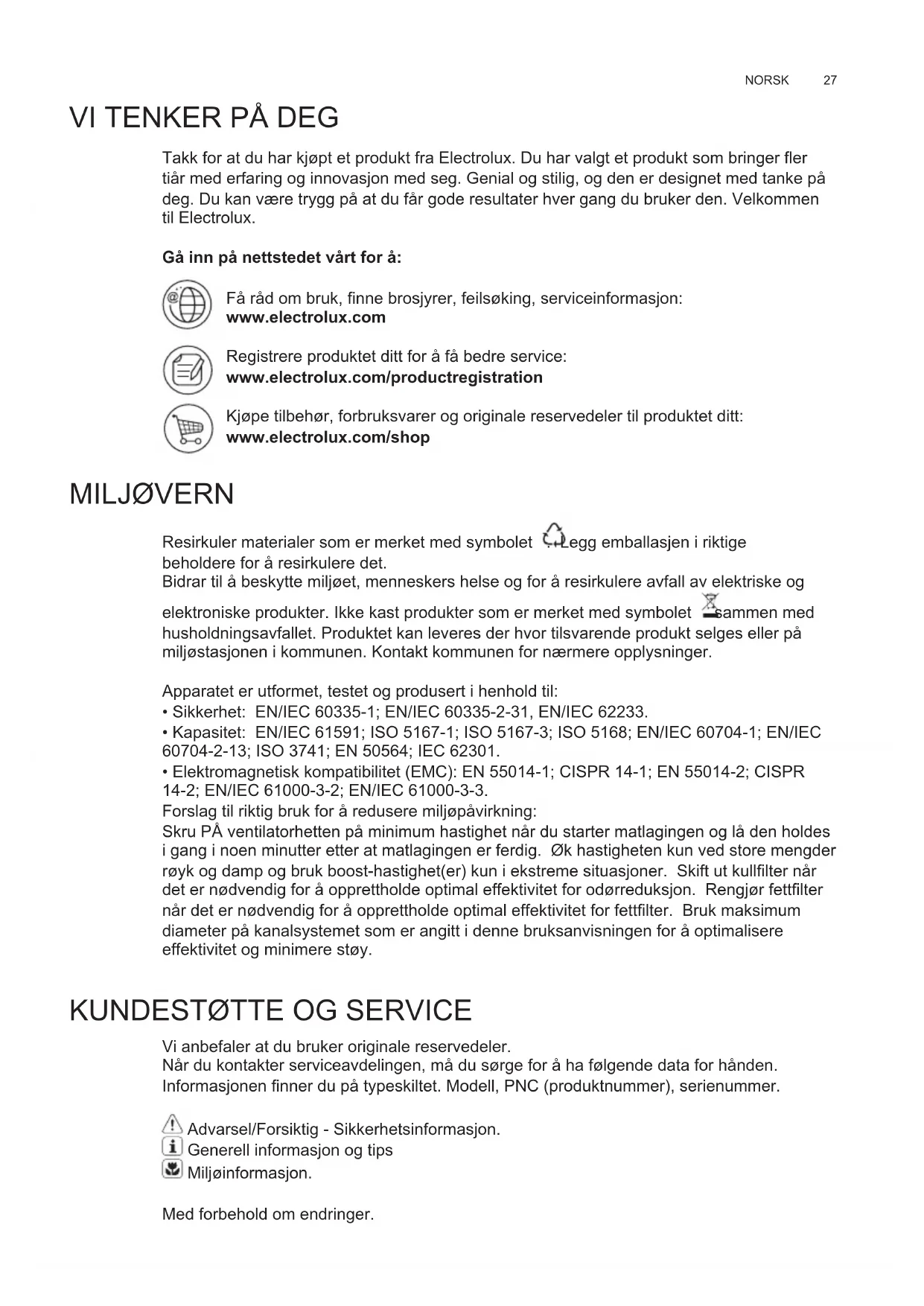 Vi anbefaler at du bruker originale reservedeler. Når du kontakter serviceavdelingen, må du sørge for å ha følgende data for hånden. Informasjonen finner du på typeskiltet. Modell, PNC (produktnummer), serienummer. Advarsel/Forsiktig - Sikkerhetsinformasjon. Generell informasjon og tips Miljøinformasjon. Med forbehold om endringer.
