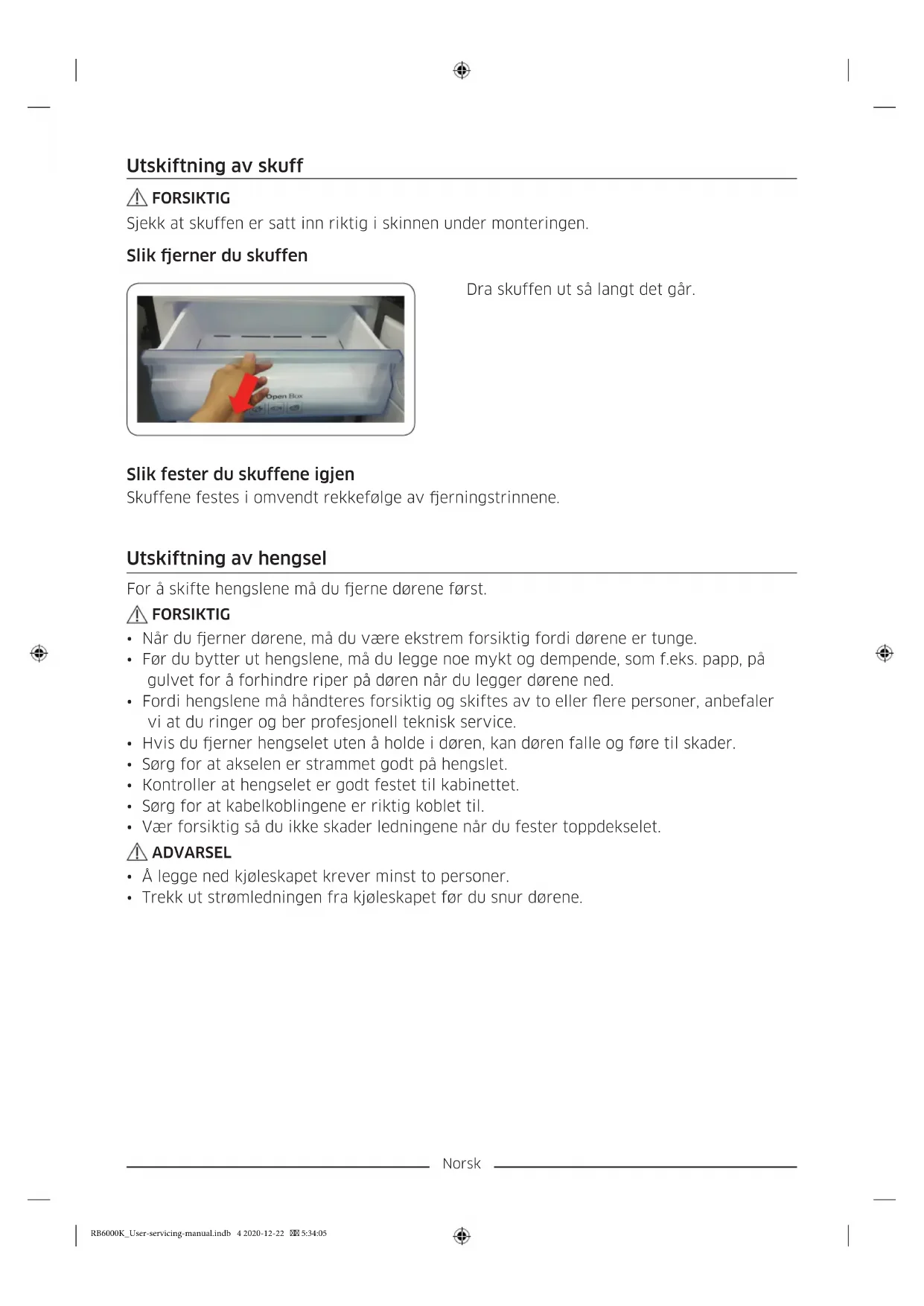 - Bruk vernehansker når du utfører reparasjoner. RB6000K_User-servicing-manual.indb 1 2020-12-22 5:34:05Norsk Det faktiske bildet og de medfølgende komponentdelene til kjøleskapet kan variere, avhengig av modell og land.