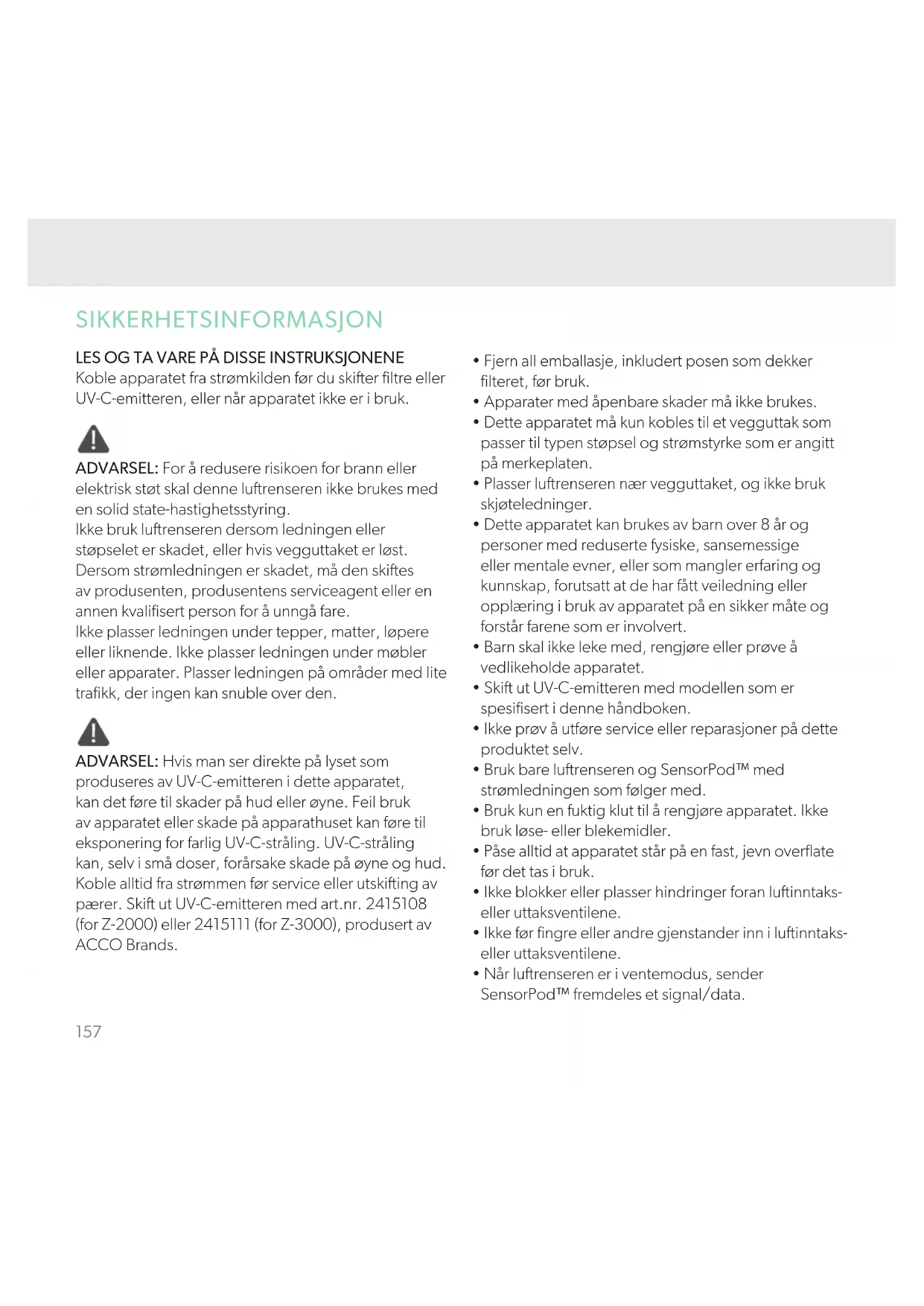 - Når lurenseren er i ventemodus, sender SensorPod™ fremdeles et signal/data.158 Drisfrekvens Trådløst: 2462 MHz Maksimal overføringskra (EIRP) Trådløst: 0 dBm Antennevinning Trådløst: 2 Dbi ACCO UK Ltd erklærer herved at radioutstyrstypene Leitz TruSens-lurenser Z-2000/Z-3000 er i samsvar med radiodirektivet 2014/53/EU. Den fullstendige teksten i EU-samsvarserklæringen er tilgjengelig på følgende internettadresse: https://declarations.accobrands.com/ En minimumsavstand på 0,2 mm må opprettholdes mellom brukerens kropp og enheten, for å overholde kravene angående RF-eksponering. Avfall fra elektrisk og elektronisk utstyr (WEEE) Når produktets levetid er over, anses det som WEEE. Da er det viktig å legge merke til at: WEEE ikke skal kastes i usortert, kommunalt avfall. Det skal samles inn separat slik at det kan demonteres og bestanddelene og materialene kan resirkuleres, brukes på nytt og gjenvinnes (som drivstoff for energiutvinning i produksjonen av elektrisitet). Kommunen har gjenvinningsstasjoner der du kan levere WEEE gratis. Lever WEEE på gjenvinningsstasjonen i nærheten av hjemmet eller kontoret ditt. Hvis du har problemer med å finne en gjenvinningsstasjon, bør forhandleren som solgte deg produktet, kunne ta imot WEEE. Hvis du ikke lenger har kontakt med forhandleren, kan du ta kontakt med ACCO for hjelp med dette. Gjenvinning av WEEE hjelper med å beskytte miljøet, beskytte menneskers helse, bevare råstoff, forbedre bærekraig utvikling og sikre bedre tilgang til råvarer i Den europeiske union. Dette oppnås ved å gjenvinne verdifulle sekundærråstoffer og redusere disponering av avfall. Du kan bidra til å nå disse målene ved å returnere WEEE til en gjenvinningsstasjon. Produktet er merket med WEEE-symbolet (søppelbøtte med kryss over). Dette symbolet informerer deg om at WEEE ikke skal kastes i usortert, kommunalt avfall. Leitz TruSens lurenser er også utstyrt med en UV- C-emitter. Ved utskiing av denne varen (i løpet av produktets levetid), må disse også returneres og kastes på ditt lokale WEEE-innsamlingsanlegg. Mer informasjon og installasjonsveiledninger / videoer for UV-C-emitteren finner du på www.leitz.com159 HOVEDFUNKSJONER SensorPod™ Ekstern overvåkingsenhet for lukvalitet som sikrer renere lu, akkurat der du trenger det. PureDirect™-teknologi Uavhengig laboratorietesting bekreer at to lustrømmer er bedre enn én, siden det beveger luen mer effektivt og komfortabelt i rommet. Informerer og tilpasser seg En fargekodet ring med belysning gir ytterligere informasjon ved å informere om lukvaliteten i sanntid. 360-graders rensing Et lupartikkelfilter fanger opp forurensende stoffer og VOC-gasser/-lukter (flyktige organiske forbindelser) fra alle retninger. UV-C-lys dreper mikrober og bakterier som kan fanges opp i filteret. Gjennomtenkt utførelse Eksepsjonell funksjonalitet innpakket i en moderne design som passer til ethvert miljø. AQI160 PRODUKTOVERSIKT Brukervennlig bærehåndtak Strøm- og signalindikator Vaskbart forfilter Lukvalitetsdisplay Luuttak Strømledning Aktivt kullfilter Brukervennlig berøringskontrollpanel Luinntak Lupartikkelfilter 360-graders luinntak Dør med enkel tilgang UV-C-lampe Filterdeksel og knott (underside) Lurenser SensorPod
