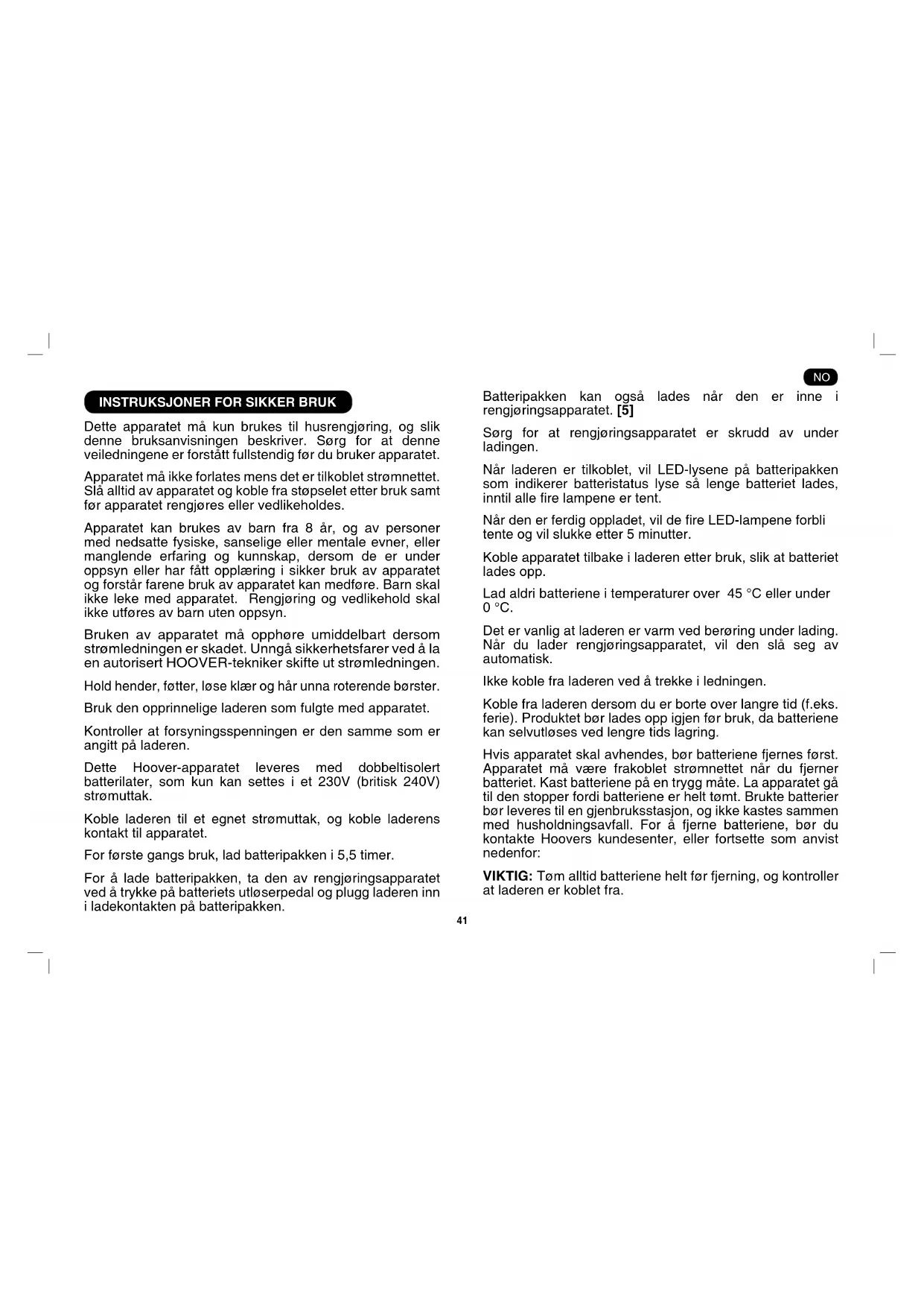 og ikke kastes sammen med husholdningsavfall. Avhending av batterier ved utgangen av produktetslevetid Hvis rengjøringsapparatet skal avhendes, bør batteriene fjernes. Brukte batterier bør leveres til en gjenbruksstasjon, og ikke kastes sammen med husholdningsavfall. VIKTIG: Tøm alltid batteriene helt før fjerning, og kontroller at laderen er koblet fra.