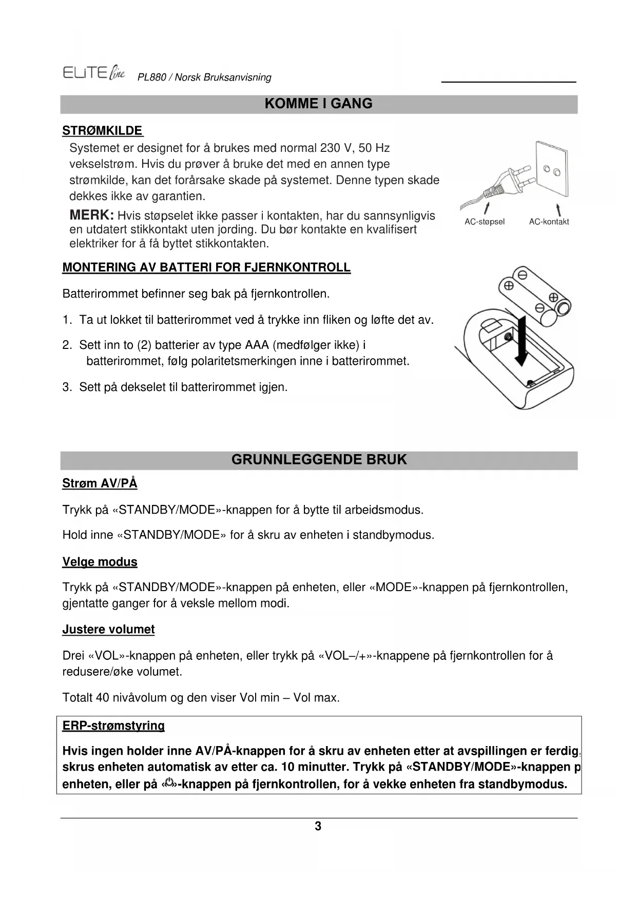 STRØMKILDE Systemet er designet for å brukes med normal 230 V, 50 Hz vekselstrøm. Hvis du prøver å bruke det med en annen type strømkilde, kan det forårsake skade på systemet. Denne typen skade dekkes ikke av garantien. MERK: Hvis støpselet ikke passer i kontakten, har du sannsynligvis en utdatert stikkontakt uten jording. Du bør kontakte en kvalifisert elektriker for å få byttet stikkontakten.