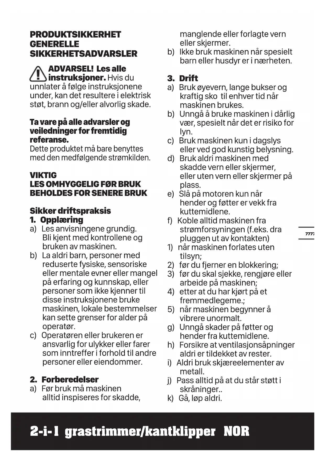 a) Bruk øyevern, lange bukser og kraftig sko til enhver tid når maskinen brukes. b) Unngå å bruke maskinen i dårlig vær, spesielt når det er risiko for lyn. c) Bruk maskinen kun i dagslys eller ved god kunstig belysning. d) Bruk aldri maskinen med skadde vern eller skjermer, eller uten vern eller skjermer på plass. e) Slå på motoren kun når hender og føtter er vekk fra kuttemidlene. f) Koble alltid maskinen fra strømforsyningen (f.eks. dra pluggen ut av kontakten)