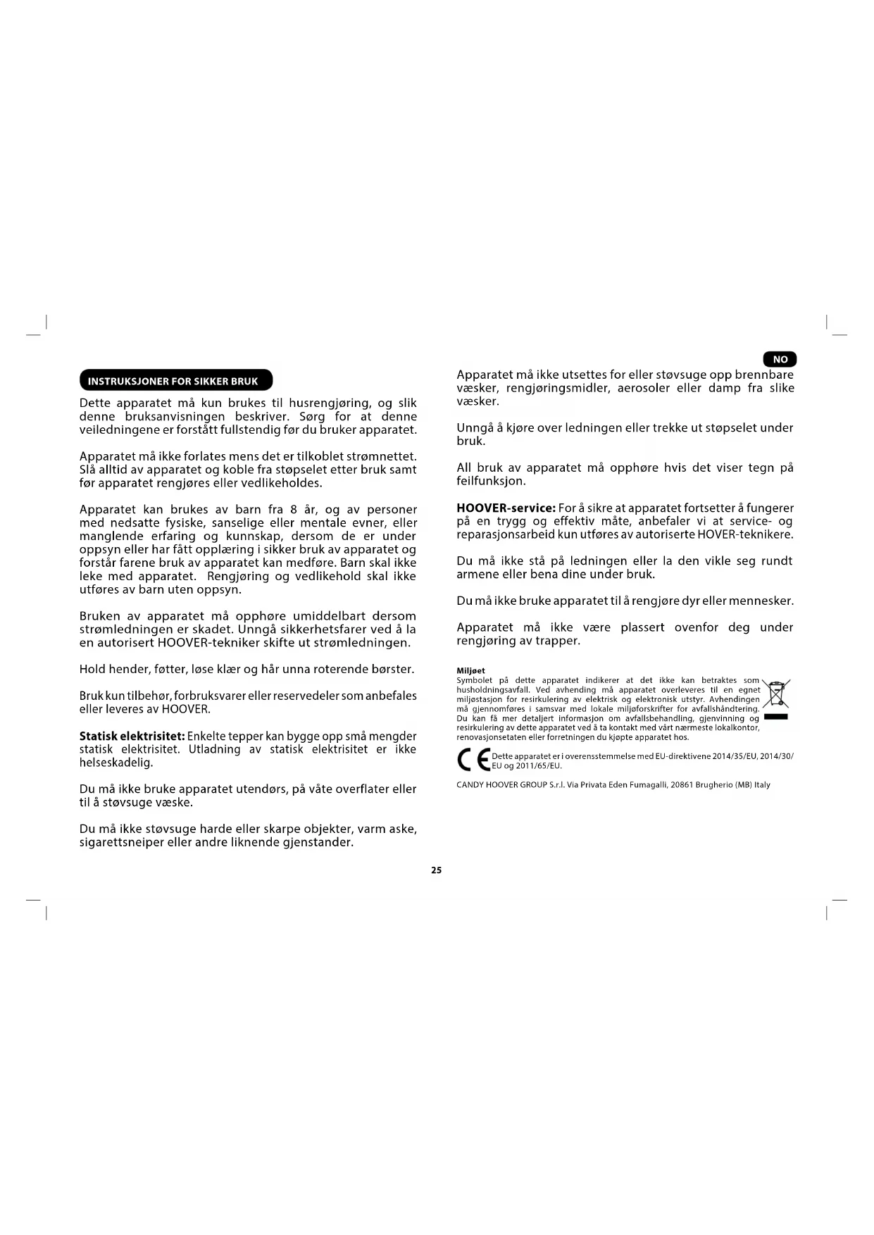 Dette apparatet må kun brukes til husrengjøring, og slik denne bruksanvisningen beskriver. Sørg for at denne veiledningene er forstått fullstendig før du bruker apparatet. Apparatet må ikke forlates mens det er tilkoblet strømnettet. Slå alltid av apparatet og koble fra støpselet etter bruk samt før apparatet rengjøres eller vedlikeholdes. Apparatet kan brukes av barn fra 8 år, og av personer med nedsatte fysiske, sanselige eller mentale evner, eller manglende erfaring og kunnskap, dersom de er under oppsyn eller har fått opplæring i sikker bruk av apparatet og forstår farene bruk av apparatet kan medføre. Barn skal ikke leke med apparatet. Rengjøring og vedlikehold skal ikke utføres av barn uten oppsyn. Bruken av apparatet må opphøre umiddelbart dersom strømledningen er skadet. Unngå sikkerhetsfarer ved å la en autorisert HOOVER-tekniker skifte ut strømledningen. Hold hender, føtter, løse klær og hår unna roterende børster. Bruk kun tilbehør, forbruksvarer eller reservedeler som anbefales eller leveres av HOOVER. Statisk elektrisitet: Enkelte tepper kan bygge opp små mengder statisk elektrisitet. Utladning av statisk elektrisitet er ikke helseskadelig. Du må ikke bruke apparatet utendørs, på våte overflater eller til å støvsuge væske. Du må ikke støvsuge harde eller skarpe objekter, varm aske, sigarettsneiper eller andre liknende gjenstander. Apparatet må ikke utsettes for eller støvsuge opp brennbare væsker, rengjøringsmidler, aerosoler eller damp fra slike væsker. Unngå å kjøre over ledningen eller trekke ut støpselet under bruk. All bruk av apparatet må opphøre hvis det viser tegn på feilfunksjon. HOOVER-service: For å sikre at apparatet fortsetter å fungerer på en trygg og effektiv måte, anbefaler vi at service- og reparasjonsarbeid kun utføres av autoriserte HOVER-teknikere. Du må ikke stå på ledningen eller la den vikle seg rundt armene eller bena dine under bruk. Du må ikke bruke apparatet til å rengjøre dyr eller mennesker. Apparatet må ikke være plassert ovenfor deg under rengjøring av trapper. Miljøet Symbolet på dette apparatet indikerer at det ikke kan betraktes som husholdningsavfall. Ved avhending må apparatet overleveres til en egnet miljøstasjon for resirkulering av elektrisk og elektronisk utstyr. Avhendingen må gjennomføres i samsvar med lokale miljøforskrifter for avfallshåndtering. Du kan få mer detaljert informasjon om avfallsbehandling, gjenvinning og resirkulering av dette apparatet ved å ta kontakt med vårt nærmeste lokalkontor, renovasjonsetaten eller forretningen du kjøpte apparatet hos. Dette apparatet er i overensstemmelse med EU-direktivene 2014/35/EU, 2014/30/ EU og 2011/65/EU. CANDY HOOVER GROUP S.r.l. Via Privata Eden Fumagalli, 20861 Brugherio (MB) Italy