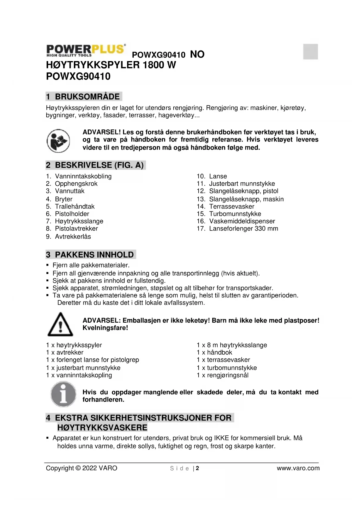 Apparatet vil ikke starte. Støpslet står ikke i. Sett i støpslet. Defekt stikkontakt. Bruk en annen stikkontakt. Defekt skjøteledning. Prøv uten skjøteledning. Ujevnt trykk. Pumpen suger luft. Sjekk at slanger og koblinger er tette. Ventiler er skitne, slitte eller fastkilte. Kontakt nærmeste servicesenter. Utilstrekkelig vannforsyning. Øk vanntrykket, sjekk om vannslangen er blokkert og/eller bytt til en større slange. Pumpepakningen er slitt. Kontakt nærmeste servicesenter. Apparatet stopper. Feil nettspenning. Kontroller at nettspenningen tilsvarer spesifikasjonene på typeskiltet. Varmesensoren er aktivert. La maskinen kjøle seg i 5 minutter. Munnstykket er delvis blokkert. Rengjør munnstykket med en nål og ved å sprøyte vann baklengs gjennom munnstykket. Ampertallet øker. Prøv uten skjøteledning. Apparatet pulserer. Luft i slange/pumpe. La apparatet gå med åpen avtrekker til vanlig brukstrykk gjenopprettes. Utilstrekkelig vannforsyning. Øk vanntrykket, sjekk om vannslangen er blokkert og/eller bytt til en større slange. Munnstykket er delvis blokkert. Rengjør munnstykket med en nål og ved å sprøyte vann baklengs gjennom munnstykket. Vannfilteret er tett. Rengjør filteret. Knekk på slangen. Rett ut slangen. Apparatet starter og stopper av seg selv. Pumpen og/eller pistolen lekker. Kontakt nærmeste servicesenter. Ingen vannforsyning. Koble til inntaksvannet. Apparatet starter, men det kommer ikke noe vann ut. Vannfilteret er tett. Rengjør filteret. Munnstykket er tett. Rengjør munnstykket med en nål og ved å sprøyte vann baklengs gjennom munnstykket.POWXG90410 DA Copyright © 2022 VARO S i d e | 1 www.varo.com 1 ANVENDELSE ................................................................................. 2