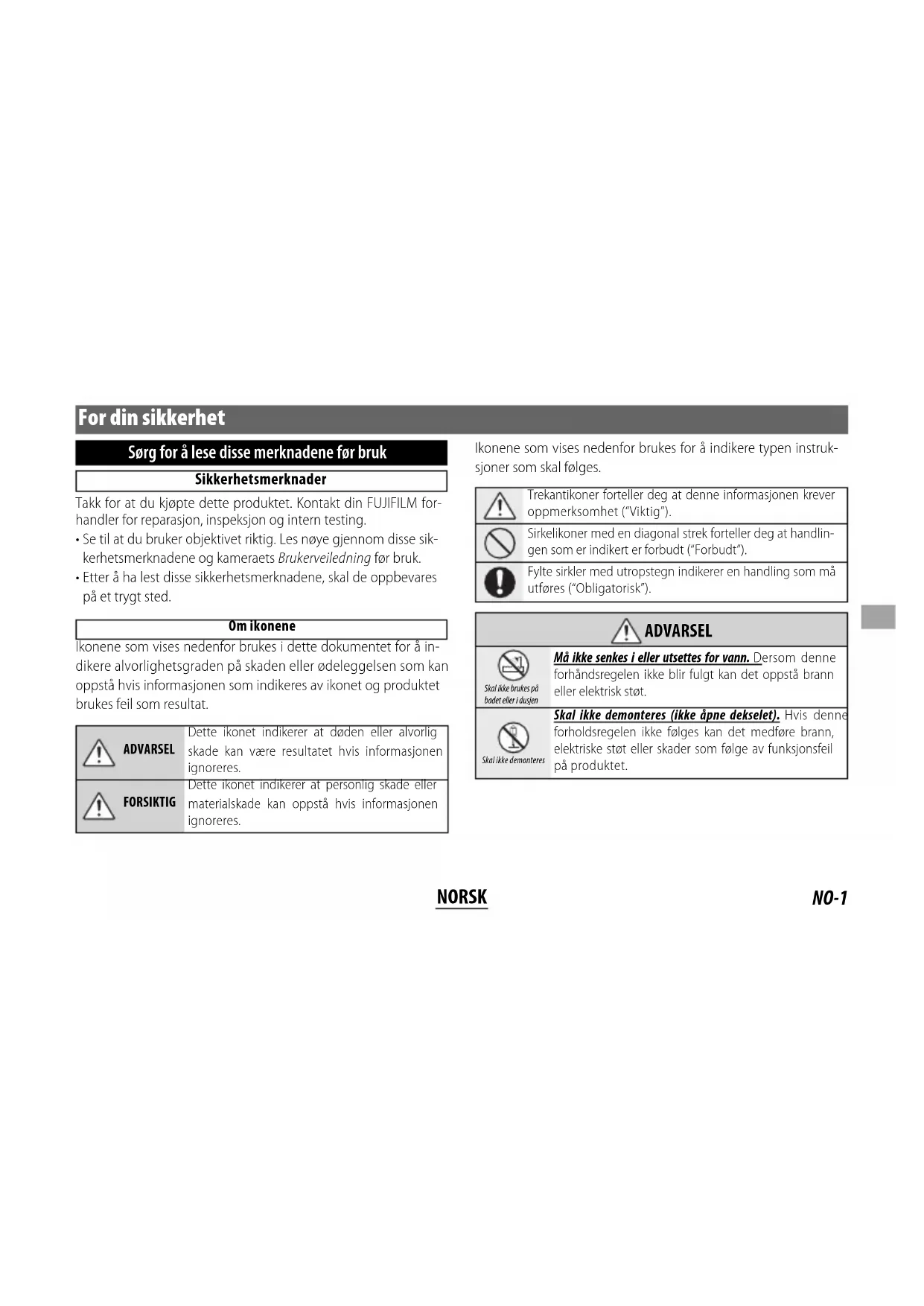 - Etter å ha lest disse sikkerhetsmerknadene, skal de oppbevares på et trygt sted. Om ikonene Ikonene som vises nedenfor brukes i dette dokumentet for å in- dikere alvorlighetsgraden på skaden eller ødeleggelsen som kan oppstå hvis informasjonen som indikeres av ikonet og produktet brukes feil som resultat. ADVARSELDette ikonet indikerer at døden eller alvorlig skade kan være resultatet hvis informasjonen ignoreres.FORSIKTIGDette ikonet indikerer at personlig skade eller materialskade kan oppstå hvis informasjonen ignoreres. Ikonene som vises nedenfor brukes for å indikere typen instruk- sjoner som skal følges. Trekantikoner forteller deg at denne informasjonen krever oppmerksomhet (“Viktig”).Sirkelikoner med en diagonal strek forteller deg at handlin-gen som er indikert er forbudt (“Forbudt”).Fylte sirkler med utropstegn indikerer en handling som må utføres (“Obligatorisk”).
