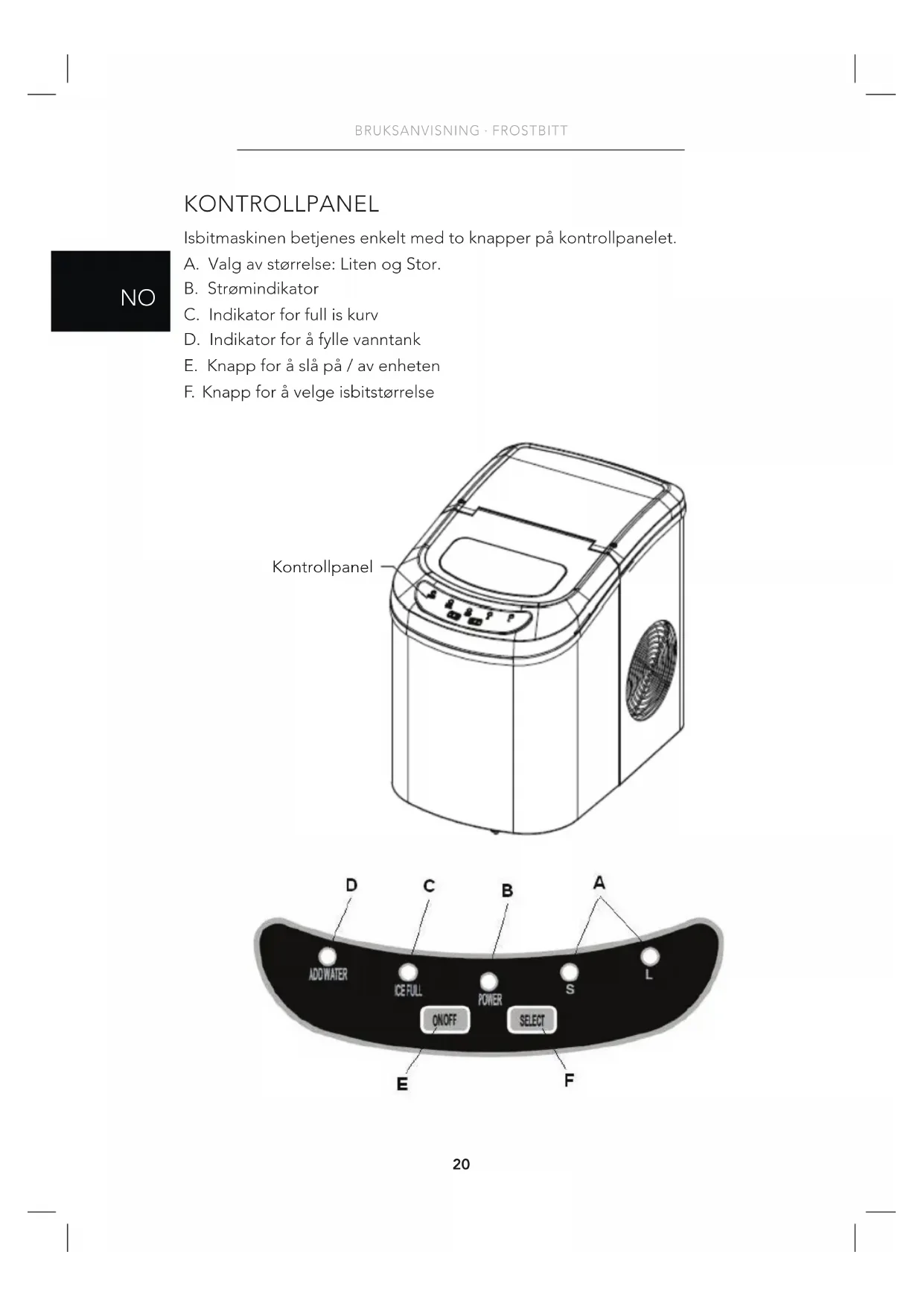 BRUKSANVISNING · FROSTBITT KONTROLLPANEL Isbitmaskinen betjenes enkelt med to knapper på kontrollpanelet. A. Valg av størrelse: Liten og Stor. B. Strømindikator C. Indikator for full is kurv D. Indikator for å fylle vanntank E. Knapp for å slå på / av enheten F. Knapp for å velge isbitstørrelse Kontrollpanel21