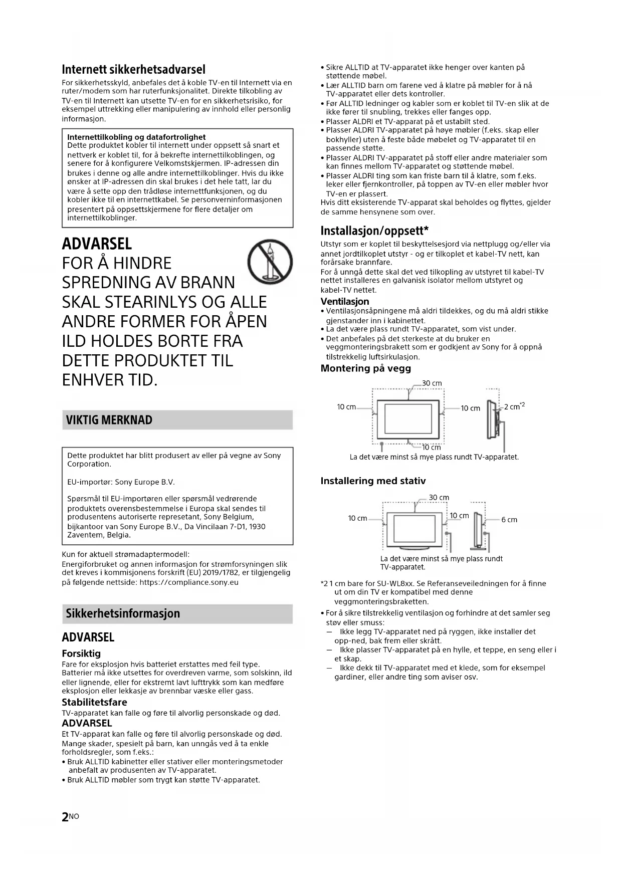 ENHVER TID. VIKTIG MERKNAD Kun for aktuell strømadaptermodell: Energiforbruket og annen informasjon for strømforsyningen slik det kreves i kommisjonens forskrift (EU) 2019/1782, er tilgjengelig på følgende nettside: https://compliance.sony.eu Sikkerhetsinformasjon ADVARSEL Forsiktig Fare for eksplosjon hvis batteriet erstattes med feil type. Batterier må ikke utsettes for overdreven varme, som solskinn, ild eller lignende, eller for ekstremt lavt lufttrykk som kan medføre eksplosjon eller lekkasje av brennbar væske eller gass. Stabilitetsfare TV-apparatet kan falle og føre til alvorlig personskade og død. ADVARSEL Et TV-apparat kan falle og føre til alvorlig personskade og død. Mange skader, spesielt på barn, kan unngås ved å ta enkle forholdsregler, som f.eks.: