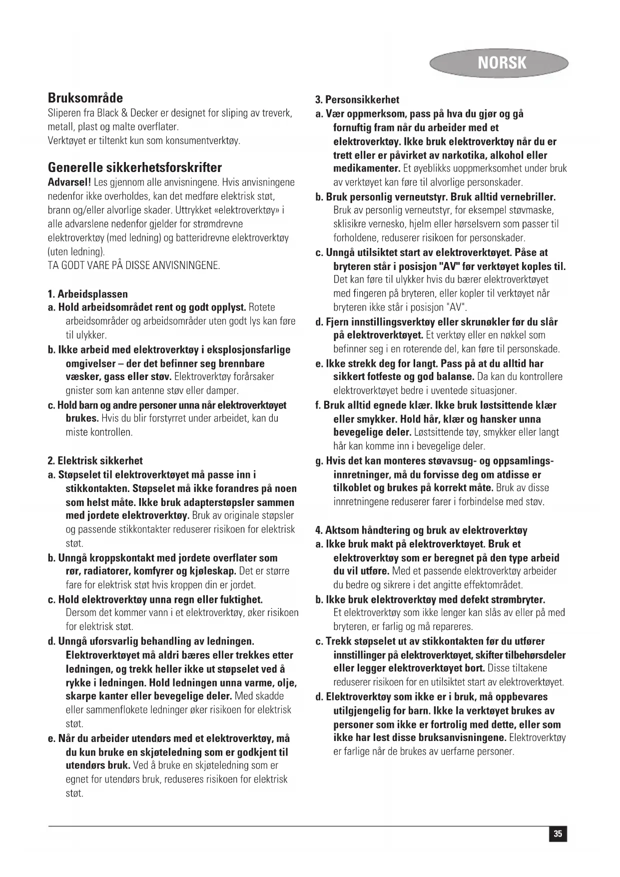 a. Elektroverktøyet ditt skal alltid repareres av kvalifisert personell og kun med originale reservedeler. Dette forsikrer at elektroverktøyets sikkerhet opprettholdes. Ekstra sikkerhetsinstrukser for slipemaskiner ◆ Advarsel! Kontakt med eller innånding av slipestøv kan være helseskadelig for brukeren og eventuelle andre tilstedeværende. Bruk en spesialmaske som verner mot støv og damp, og pass på at andre som oppholder seg eller kommer inn i området der du arbeider, også beskytter seg. ◆ Fjern alt støv grundig etter sliping. ◆ Vær ekstra forsiktig når du pusser maling som kan inneholde bly, eller metall som kan avgi giftig støv: – La ikke barn eller gravide komme inn der du arbeider. – Ikke spis, drikk eller røyk der du arbeider. – Kvitt deg med støvpartikler eller annet avfall på en miljøvennlig måte. Elektrisk sikkerhet Dette apparatet er dobbeltisolert. Derfor er ikke jording nødvendig. Kontroller at nettspenningen er i overensstemmelse med spenningen på typeskiltet. ◆ Dette apparatet er ikke beregnet for bruk av unge eller uerfarne personer uten tilsyn. Barn må ha tilsyn for å sikre at de ikke leker med apparatet. ◆ Hvis strømledningen skades, må den skiftes ut av fabrikanten eller et autorisert Black & Decker servicesenter for å unngå fare. Funksjoner Dette verktøyet har noen av eller alle følgende funksjoner: