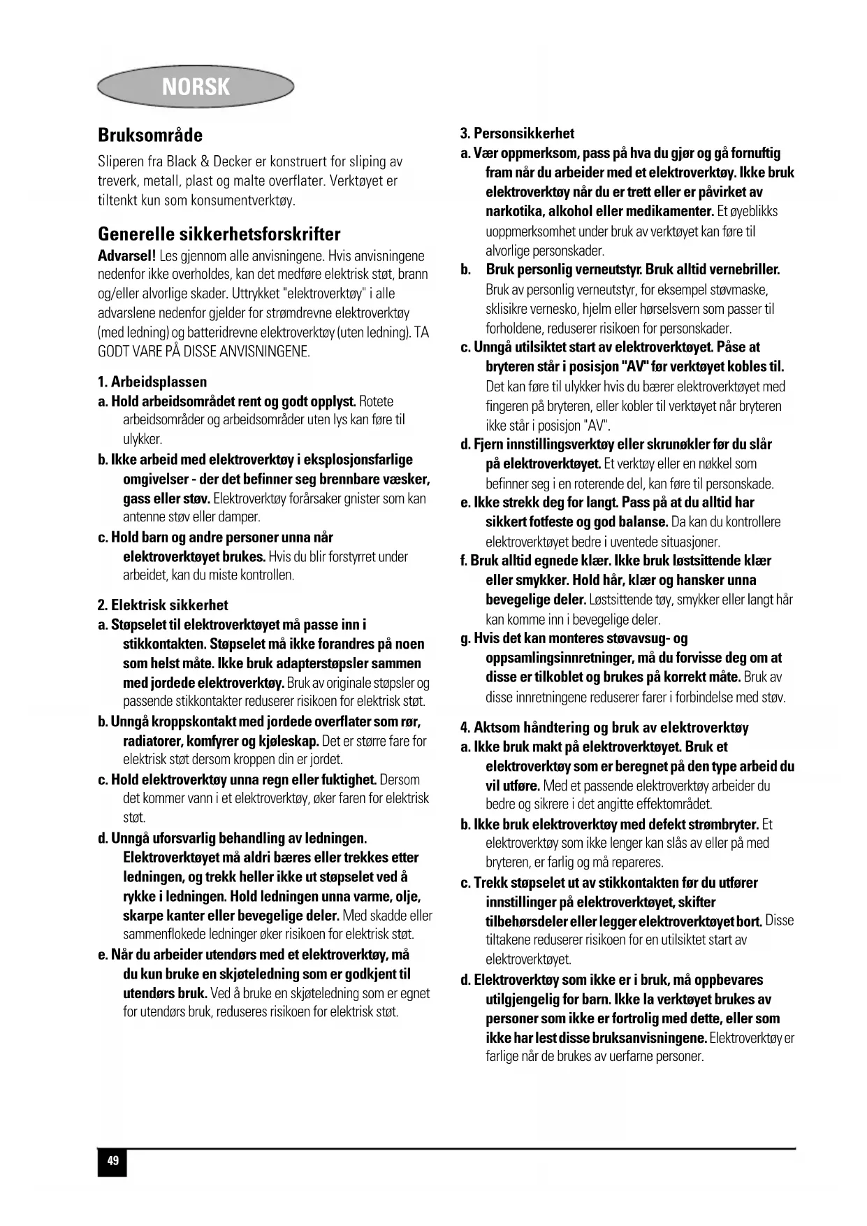 a. Elektroverktøyet ditt skal alltid repareres av kvalifisert personell og kun med originale reservedeler. Dette sikrer at elektroverktøyets sikkerhet opprettholdes. Ekstra sikkerhetsinstrukser for slipemaskiner X Bruk alltid støvmaske under sliping. X Fjern alt støv grundig etter sliping. X Vær ekstra forsiktig når du pusser maling som kan inneholde bly, eller metall som kan avgi giftig støv: - Bruk en spesialmaske som verner mot støv fra blymaling og damp, og pass på at andre som oppholder seg eller kommer inn i området der du arbeider, også beskytter seg. - Ikke la barn eller gravide komme inn der du arbeider. - Ikke spis, drikk eller røyk der du arbeider. - Kvitt deg med støvpartikler eller annet avfall på en miljøvennlig måte. X Før verktøyet brukes på trematerialer, må støvkassetten monteres. X Før verktøyet brukes på metall, må støvkassetten fjernes. X Verktøyet må aldri brukes uten slipepapir. X Verktøyet må aldri brukes uten slipebase. X Dette apparatet skal ikke brukes av barn eller svakelige personer uten tilsyn. Påse at barn ikke leker med apparatet. X Hvis strømledningen blir skadet, må den skiftes av produsenten eller et autorisert Black & Decker- servicesenter for å unngå fare. Elektrisk sikkerhet Dette apparatet er dobbeltisolert. Jording er derfor ikke nødvendig. Kontroller at spenningen er i overensstemmelse med spenningen på typeskiltet. Funksjoner