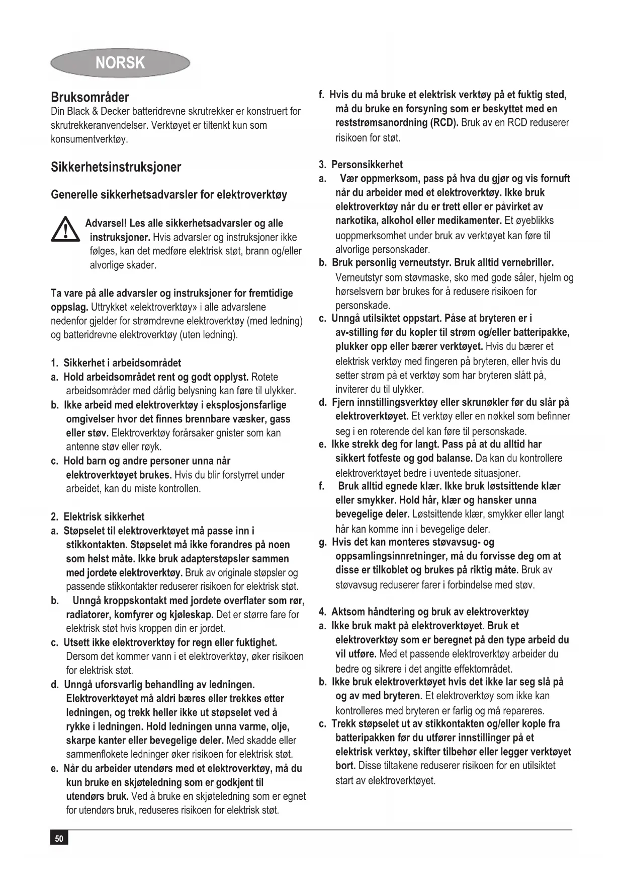 Advarsel! Bruker må lese bruksanvisningen for å redusere faren for skader. Ekstra sikkerhetsforskrifter for batterier og ladere Batterier u Gjør aldri under noen omstendigheter forsøk på å åpne apparatet. u Batteriet må ikke komme i kontakt med vann.u Batteriet må ikke utsettes for varme.u Apparatet må ikke oppbevares på steder hvor temperaturen kan overstige 40 °C. u Må bare lades i lufttemperaturer mellom 10 °C og 40 °C.u Må bare lades med laderen som følger med verktøyet.u Når batteriene skal kastes, følg instruksene i avsnittet "Miljøvern". Ladere u Bruk din Black & Decker lader kun sammen med det batteriet som blir levert med verktøyet. Andre typer batterier kan eksplodere og forårsake person- og materialskader. u Forsøk aldri å lade ikke-oppladbare batterier.u Bytt straks ut defekte ledninger.u Laderen må ikke komme i kontakt med vann.u Laderen må ikke åpnes.u Ikke undersøk laderen på egenhånd.