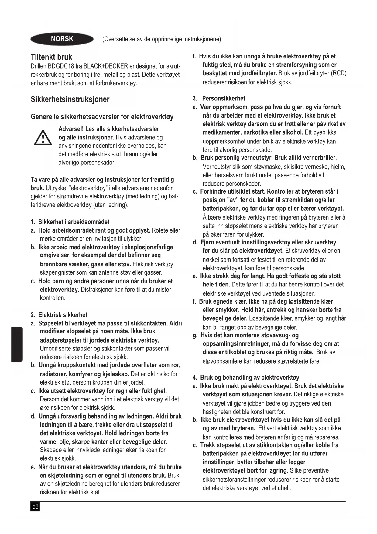Advarsel! Les alle sikkerhetsadvarsler og alle instruksjoner. Hvis advarslene og anvisningene nedenfor ikke overholdes, kan det medføre elektrisk støt, brann og/eller alvorlige personskader. Ta vare på alle advarsler og instruksjoner for fremtidig bruk. Uttrykket ”elektroverktøy” i alle advarslene nedenfor gjelder for strømdrevne elektroverktøy (med ledning) og bat- teridrevne elektroverktøy (uten ledning).