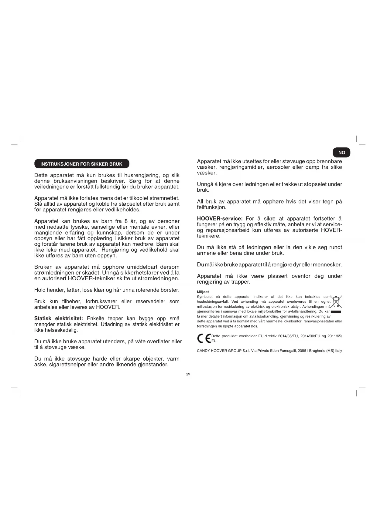 Dette apparatet må kun brukes til husrengjøring, og slik denne bruksanvisningen beskriver. Sørg for at denne veiledningene er forstått fullstendig før du bruker apparatet. Apparatet må ikke forlates mens det er tilkoblet strømnettet. Slå alltid av apparatet og koble fra støpselet etter bruk samt før apparatet rengjøres eller vedlikeholdes. Apparatet kan brukes av barn fra 8 år, og av personer med nedsatte fysiske, sanselige eller mentale evner, eller manglende erfaring og kunnskap, dersom de er under oppsyn eller har fått opplæring i sikker bruk av apparatet og forstår farene bruk av apparatet kan medføre. Barn skal ikke leke med apparatet. Rengjøring og vedlikehold skal ikke utføres av barn uten oppsyn. Bruken av apparatet må opphøre umiddelbart dersom strømledningen er skadet. Unngå sikkerhetsfarer ved å la en autorisert HOOVER-tekniker skifte ut strømledningen. Hold hender, føtter, løse klær og hår unna roterende børster. Bruk kun tilbehør, forbruksvarer eller reservedeler som anbefales eller leveres av HOOVER. Statisk elektrisitet: Enkelte tepper kan bygge opp små mengder statisk elektrisitet. Utladning av statisk elektrisitet er ikke helseskadelig. Du må ikke bruke apparatet utendørs, på våte overater eller til å støvsuge væske. Du må ikke støvsuge harde eller skarpe objekter, varm aske, sigarettsneiper eller andre liknende gjenstander. Apparatet må ikke utsettes for eller støvsuge opp brennbare væsker, rengjøringsmidler, aerosoler eller damp fra slike væsker. Unngå å kjøre over ledningen eller trekke ut støpselet under bruk. All bruk av apparatet må opphøre hvis det viser tegn på feilfunksjon. HOOVER-service: For å sikre at apparatet fortsetter å fungerer på en trygg og effektiv måte, anbefaler vi at service- og reparasjonsarbeid kun utføres av autoriserte HOVER- teknikere. Du må ikke stå på ledningen eller la den vikle seg rundt armene eller bena dine under bruk. Du må ikke bruke apparatet til å rengjøre dyr eller mennesker. Apparatet må ikke være plassert ovenfor deg under rengjøring av trapper. Miljøet Symbolet på dette apparatet indikerer at det ikke kan betraktes som husholdningsavfall. Ved avhending må apparatet overleveres til en egnet miljøstasjon for resirkulering av elektrisk og elektronisk utstyr. Avhendingen må gjennomføres i samsvar med lokale miljøforskrifter for avfallshåndtering. Du kan få mer detaljert informasjon om avfallsbehandling, gjenvinning og resirkulering av dette apparatet ved å ta kontakt med vårt nærmeste lokalkontor, renovasjonsetaten eller forretningen du kjøpte apparatet hos. Dette produktet overholder EU-direktiv 2014/35/EU, 2014/30/EU og 2011/65/ EU. CANDY HOOVER GROUP S.r.l. Via Privata Eden Fumagalli, 20861 Brugherio (MB) Italy NO30 *Bare enkelte modeller ** Kun for enkelte mdeller. Munnstykkene kan variere fra modell til modell