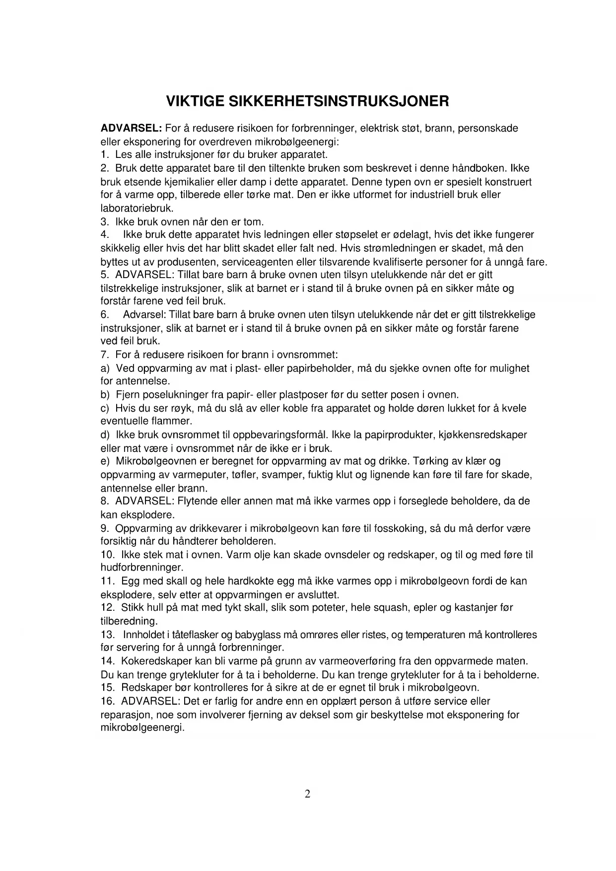 a) Ved oppvarming av mat i plast- eller papirbeholder, må du sjekke ovnen ofte for mulighet for antennelse. b) Fjern poselukninger fra papir- eller plastposer før du setter posen i ovnen. c) Hvis du ser røyk, må du slå av eller koble fra apparatet og holde døren lukket for å kvele eventuelle flammer. d) Ikke bruk ovnsrommet til oppbevaringsformål. Ikke la papirprodukter, kjøkkensredskaper eller mat være i ovnsrommet når de ikke er i bruk. e) Mikrobølgeovnen er beregnet for oppvarming av mat og drikke. Tørking av klær og oppvarming av varmeputer, tøfler, svamper, fuktig klut og lignende kan føre til fare for skade, antennelse eller brann.