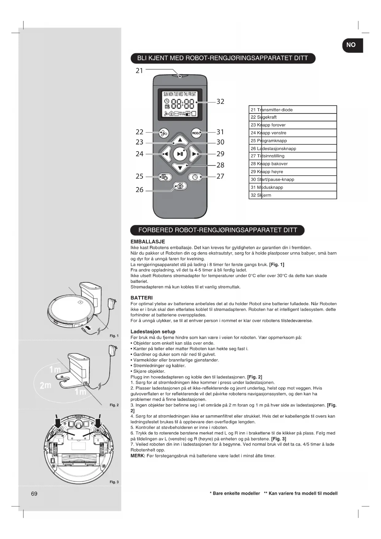 EMBALLASJE Ikke kast Robotens emballasje. Det kan kreves for gyldigheten av garantien din i fremtiden. Når du pakker ut Roboten din og dens ekstrautstyr, sørg for å holde plastposer unna babyer, små barn og dyr for å unngå faren for kvelning. La rengjøringsapparatet stå på lading i 8 timer før første gangs bruk. [Fig. 1] Fra andre oppladning, vil det ta 4-5 timer å bli ferdig ladet. Ikke utsett Robotens strømadapter for temperaturer under 0°C eller over 30°C da dette kan skade batteriet. Strømadapteren må kun kobles til et vanlig strømuttak. BATTERI For optimal ytelse av batteriene anbefales det at du holder Robot sine batterier fulladede. Når Roboten ikke er i bruk skal den etterlates koblet til strømadapteren. Roboten har et intelligent ladesystem. dette forhindrer at batteriene overopplades. For å unngå ulykker, se til at enhver person i rommet er klar over robotens tilstedeværelse. Ladestasjon setup Før bruk må du fjerne hindre som kan være i veien for roboten. Vær oppmerksom på: