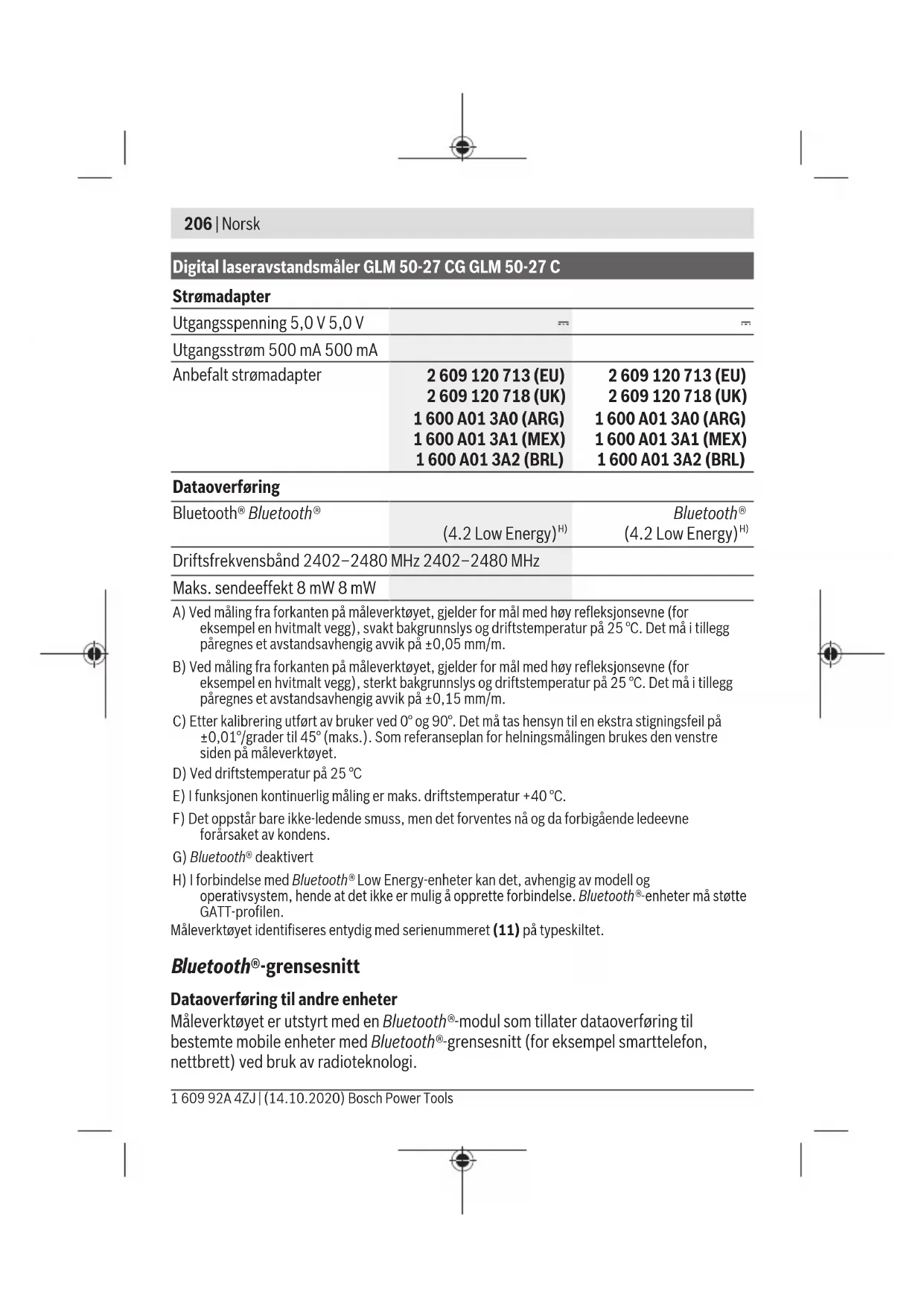 Driftsfrekvensbånd 2402–2480 MHz 2402–2480 MHz Maks. sendeeffekt 8 mW 8 mW A) Ved måling fra forkanten på måleverktøyet, gjelder for mål med høy refleksjonsevne (for eksempel en hvitmalt vegg), svakt bakgrunnslys og driftstemperatur på 25 °C. Det må i tillegg påregnes et avstandsavhengig avvik på ±0,05mm/m. B) Ved måling fra forkanten på måleverktøyet, gjelder for mål med høy refleksjonsevne (for eksempel en hvitmalt vegg), sterkt bakgrunnslys og driftstemperatur på 25 °C. Det må i tillegg påregnes et avstandsavhengig avvik på ±0,15mm/m. C) Etter kalibrering utført av bruker ved 0° og 90°. Det må tas hensyn til en ekstra stigningsfeil på ±0,01°/grader til 45° (maks.). Som referanseplan for helningsmålingen brukes den venstre siden på måleverktøyet. D) Ved driftstemperatur på 25°C E) I funksjonen kontinuerlig måling er maks. driftstemperatur +40 °C. F) Det oppstår bare ikke-ledende smuss, men det forventes nå og da forbigående ledeevne forårsaket av kondens. G) Bluetooth® deaktivert H) I forbindelse med Bluetooth® Low Energy-enheter kan det, avhengig av modell og operativsystem, hende at det ikke er mulig å opprette forbindelse. Bluetooth®-enheter må støtte GATT-profilen. Måleverktøyet identifiseres entydig med serienummeret(11) på typeskiltet. Bluetooth®-grensesnitt Dataoverføring til andre enheter Måleverktøyet er utstyrt med en Bluetooth®-modul som tillater dataoverføring til bestemte mobile enheter med Bluetooth®-grensesnitt (for eksempel smarttelefon, nettbrett) ved bruk av radioteknologi. 1 609 92A 4ZJ | (14.10.2020) Bosch Power ToolsNorsk | 207 Du finner informasjon om systemkrav for en Bluetooth® forbindelse på nettsiden til Bosch www.bosch-pt.com. u Du finner mer informasjon på produktsiden til Bosch. Ved dataoverføring med Bluetooth® kan det forekomme tidsforsinkelser mellom den mobile enheten og måleverktøyet. Disse kan skyldes avstanden mellom de to enhetene, eller selve måleobjektet. Aktivering av Bluetooth®- grensesnittet for dataoverføring til en mobil enhet Kontroller at Bluetooth®-grensesnittet er aktivert på den mobile enheten. Trykk på(1)-knappen for å åpne Bluetooth®-menyen, og trykk på(1)-knappen igjen (eller knappen (6) [+]) for å aktivere Bluetooth®-grensesnittet. Hvis flere aktive måleverktøy blir funnet, velger du ønsket måleverktøy ut fra serienummeret. Du finner serienummeret(11) på måleverktøyets typeskilt. Tilkoblingsstatusen og den aktive tilkoblingen(b) vises i statuslinjen(h) til måleverktøyet. Med apper fra Bosch kan du utvide med flere funksjoner. Disse kan lastes ned fra de forskjellige app-butikkene, avhengig av enhetstypen. Deaktivering av Bluetooth®-grensesnittet Trykk på(1)-knappen for å åpne Bluetooth®-menyen, og trykk på(1)-knappen igjen (eller knappen (3) [–]) for å deaktivere Bluetooth®-grensesnittet. Montering Sette inn / bytte batterier For drift av måleverktøyet anbefales det å bruke alkali-mangan-batterier eller nikkel- metallhydridbatterier (spesielt ved lave driftstemperaturer). Med 1,2 V-batterier kan antall mulige målinger eventuelt være høyere enn med 1,5 V- batterier. For å åpne dekselet til batterirommet(13) trykker du på låsen (12) og tar av dekselet. Sett inn batteriene. Pass på riktig polaritet, som vist på innsiden av batterirommet. Ved lavt batterinivå vises et spørsmål om aktivering av batterisparemodus i displayet. Når batterisparemodus er aktivert, forlenges batteritiden, og batterisymbolet vises med en gul ramme i displayet(se „Menyen «Innstillinger» (se bilde C)“, Side210). Når symbolet med tomt batteri vises første gang i displayet, er det fortsatt mulig å foreta noen få målinger til. Når batterisymbolet er tomt og blinker rødt, kan du ikke foreta flere målinger. Skift ut batteriene. Skift alltid ut alle de oppladbare batteriene eller engangsbatteriene samtidig. Bruk bare batterier fra én produsent og med samme kapasitet. Bosch Power Tools 1 609 92A 4ZJ | (14.10.2020)208 | Norsk u Ta batteriene, enten du bruker engangsbatterier eller oppladbare, ut av måleverktøyet når du ikke skal bruke det på lengre tid. Ved langvarig lagring kan batteriene korrodere og selvutlades. Sette inn/bytte li-ion-batteripakke (tilbehør) Sett inn li-ion-batteripakken (24) (se bilde A). For å ta ut li-ion-batteripakken (24) trykker du på låsen (25) og tar li-ion-batteripakken ut. Bruk Lade li-ion-batteripakken (tilbehør) Merk: Batteriet er delvis ladet ved levering. For å sikre full batteriytelse lader du batteriet helt før første gangs bruk. USB-kontakten for tilkobling av USB-kabelen (26) og ladekontrollampen befinner seg under dekselet til USB-kontakten (27) på li-ion-batteripakken (24) (tilbehør). Åpne dekselet til USB-kontakten (27), og koble til USB-kabelen (26). Under ladingen kan batterinivået som vises i displayet avvike fra det faktiske ladenivået til li-ion-batteripakken (24). Når li-ion-batteripakken (24) er fulladet, lyser ladekontrollampen grønt. Under ladingen lyser ladekontrollampen gult. En rød ladekontrollampe signaliserer at ladespenningen eller ladestrømmen er uegnet. Igangsetting u Ikke gå fra måleverktøyet når det er slått på, og slå alltid av måleverktøyet etter bruk. Andre personer kan bli blendet av laserstrålen. u Beskytt måleverktøyet mot fuktighet og direkte sollys. u Måleverktøyet må ikke utsettes for ekstreme temperaturer eller temperatursvingninger. La det for eksempel ikke ligge lenge i bilen. Ved store temperatursvingninger bør måleverktøyet tempereres før det brukes. Ved ekstreme temperaturer eller temperatursvingninger kan målevertøyets presisjon svekkes. u Pass på at måleverktøyet ikke utsettes for harde slag eller fall. Etter sterk ytre påvirkning på måleverktøyet bør du alltid kontrollere nøyaktigheten før du fortsetter arbeidet (se „Kontroll av nøyaktigheten til og kalibrering av helningsmålingen (se bildeM)“, Side217) og
